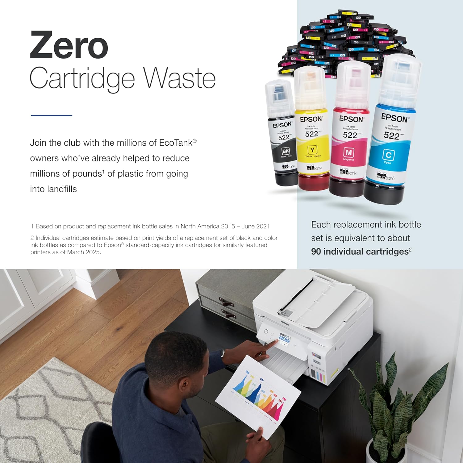 - Zero Cartridge Waste – By using an EcoTank printer, you can help reduce the amount of cartridge waste ending up in landfills