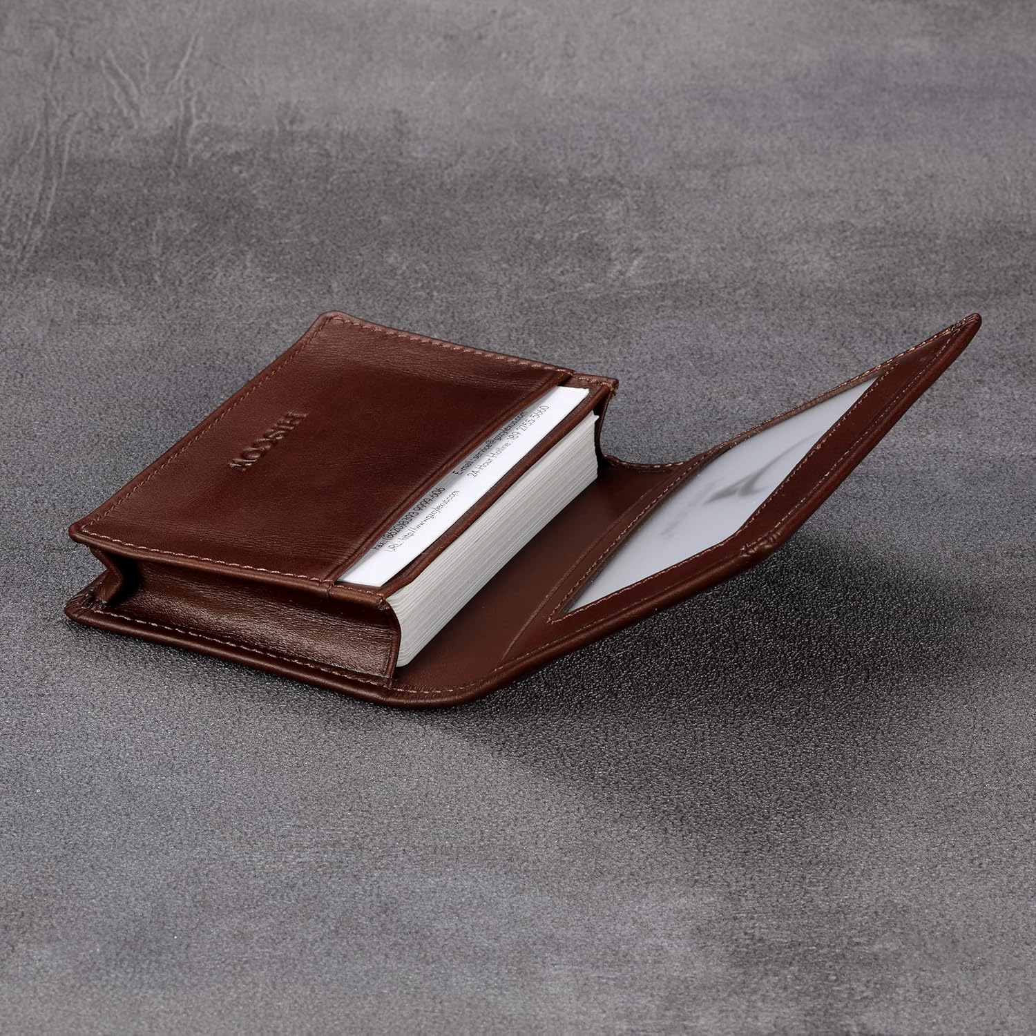 - What You Get: HISCOW Leather Business Card Holder, in an exact-fitting and classy matte-black box. Welcome guide, our worry-free 12-month warranty and friendly customer service