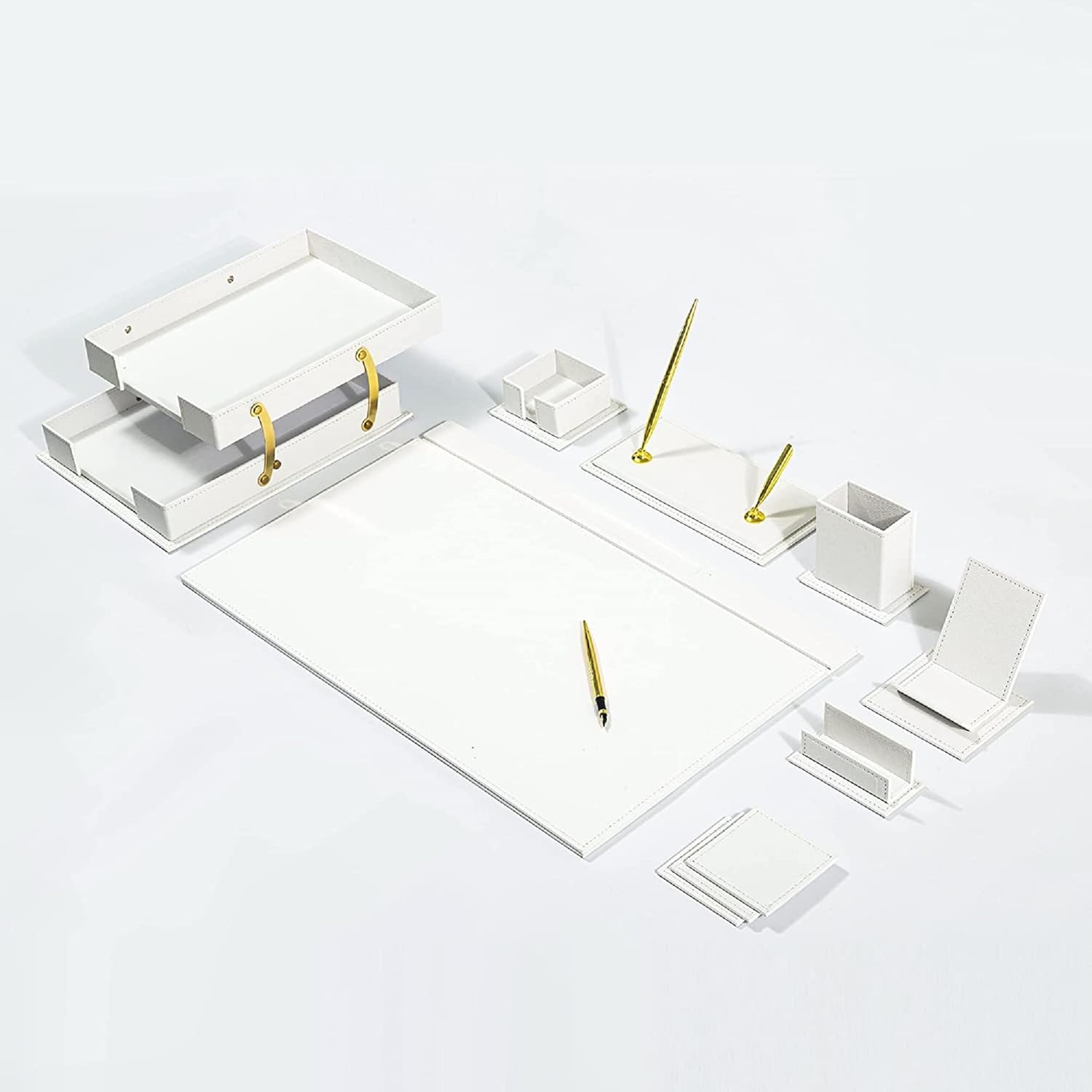 - We are offering you the opportunity to find the office accessories that you need, conceived by our finest leather artisans. Made with authentic leather and in a unique palette of colors, you will definitely add a distinct touch of class to your office décor. Our leather office sets are also well coveted among professionals who use them in conference or meeting rooms.