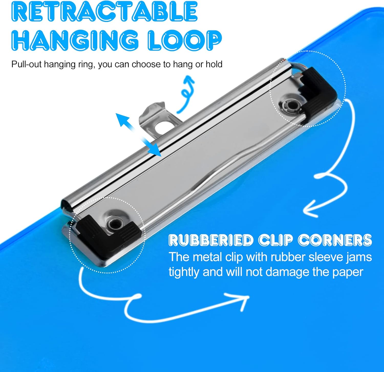- RETRACTABLE HANGING LOOP: The transparent color plastic clipboards have a built-in hanging hole, which can help you place your documents randomly. And it can be stowed away when not needed