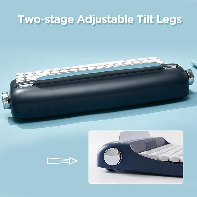 - VINTAGE TYPEWRITER KEYBOARD WITH INTEGRATED STAND: The YUNZII actto B303 wireless typewriter keyboard includes an integrated stand holder for pad, phone and tablet, which matches the aesthetic of your desk and saves space. The wireless mini compact also includes adjustable feet, allowing you to set the angle for maximum comfort during long typing sessions. The built-in tablet or phone holder is 12.9 inches long and 0.59 inches wide.