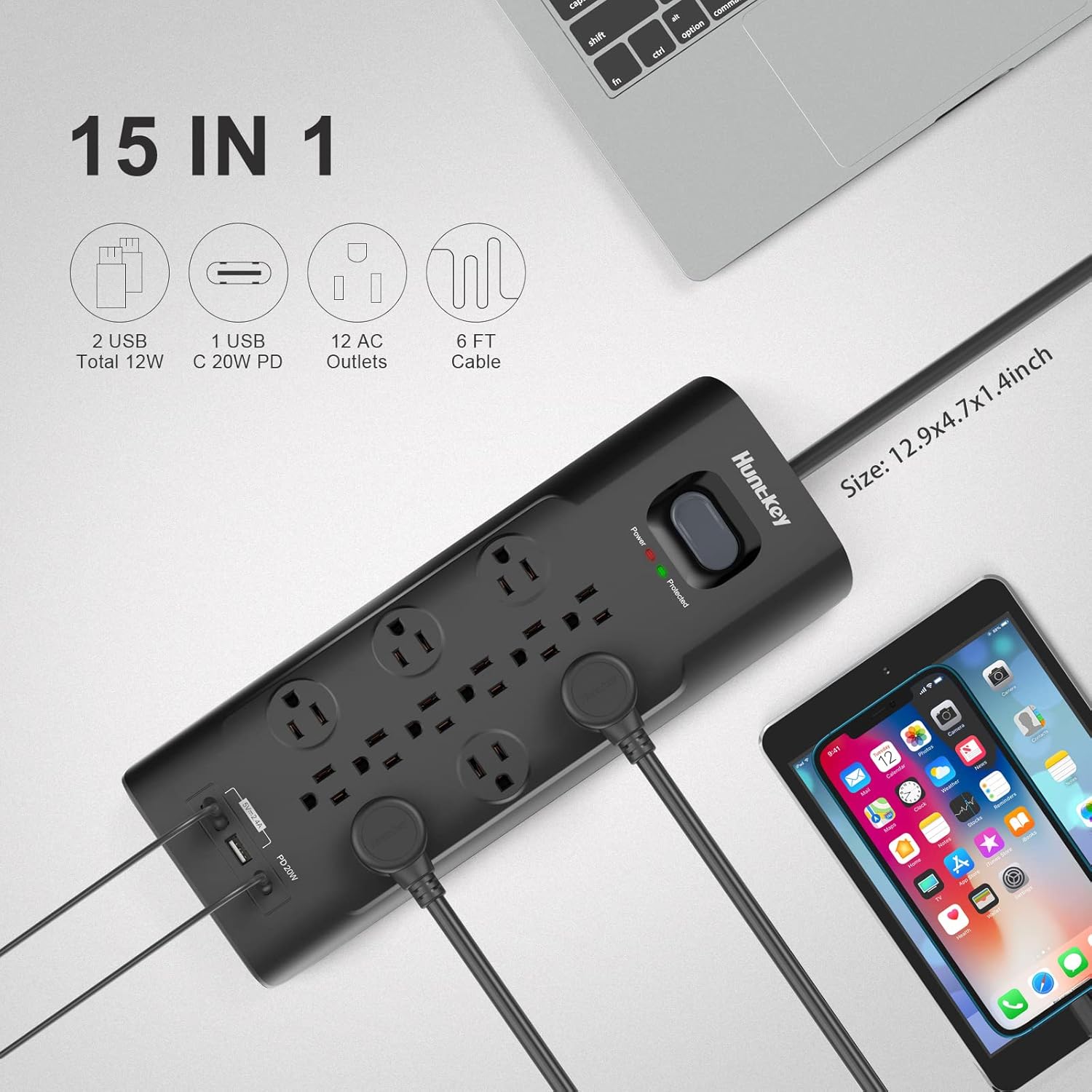 Surge Protector Power Strip (3480J), Huntkey 12 Outlets with 2 USB A Ports and 1 USB C Ports, 20W Power Delivery Charging for Home, Office, Dorm Essential, ETL Listed