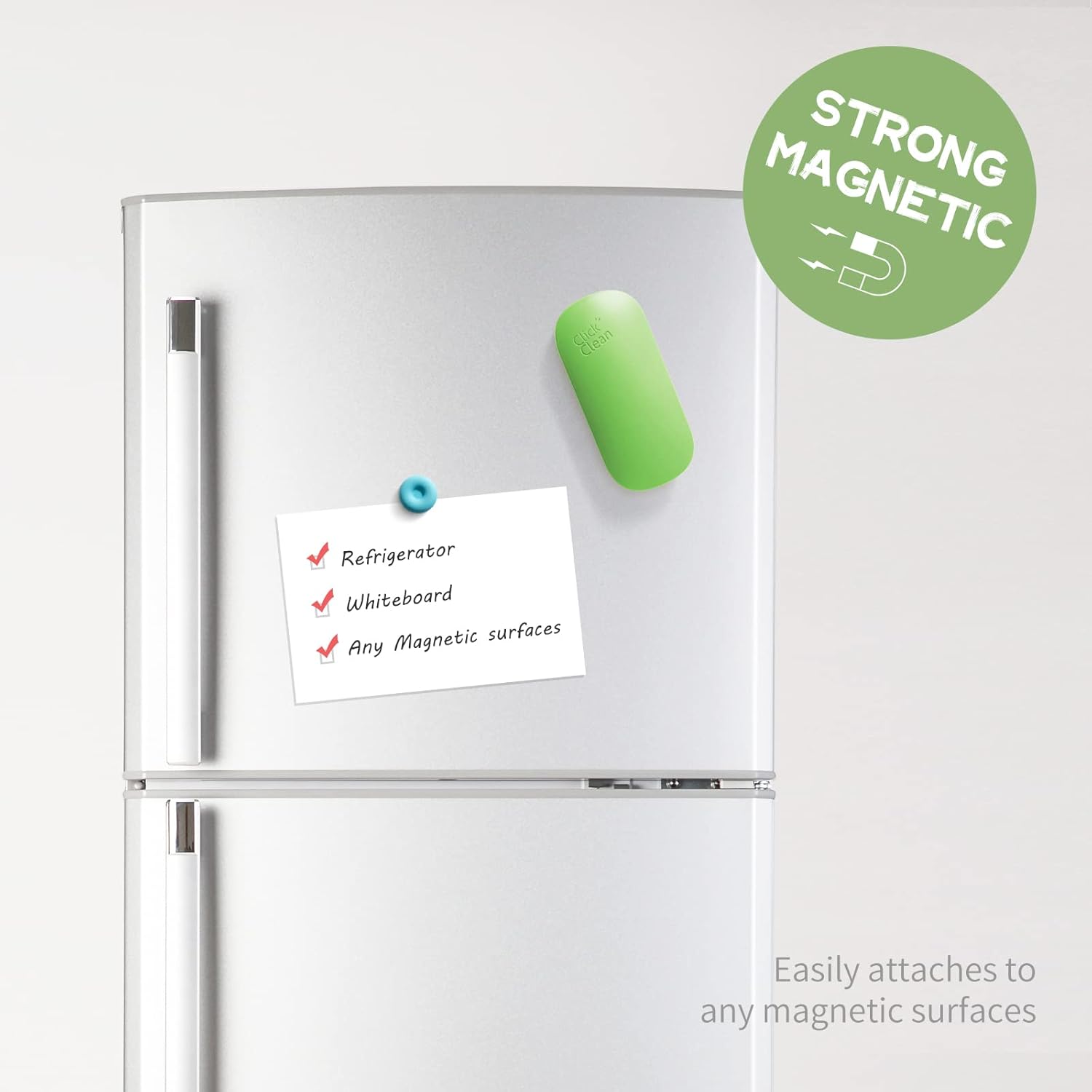 CLICK CLEAN Replaceable Dry Erase Board Eraser, 4-in-1 Magnetic Whiteboard Eraser with 3 Replaceable Felt Pads, Free 3.4oz Whiteboard Cleaner Included, Intended for Classroom, Home and Office