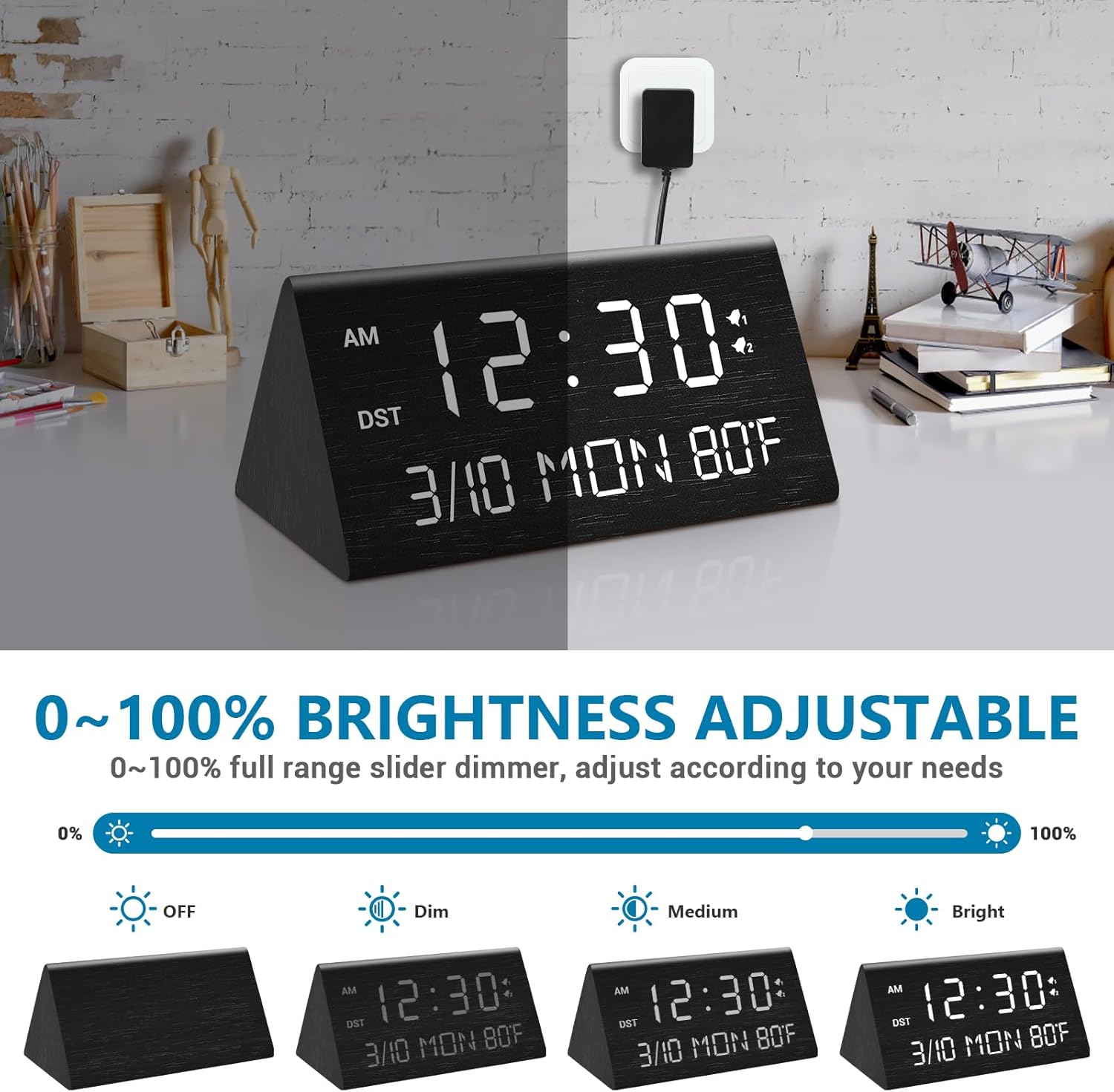 - ⏰【5 Level Brightness Adjustable alarm clock】- Compared with the alarm clocks on the market that only have three levels of brightness adjustment, this wooden alarm clock is upgraded to 5-level dimming. Customers can adjust the brightness to 5 percentile(0, 20%, 40%, 60%, 80%, 100%), which solves the problem of too bright display at night and helps you fall asleep better.