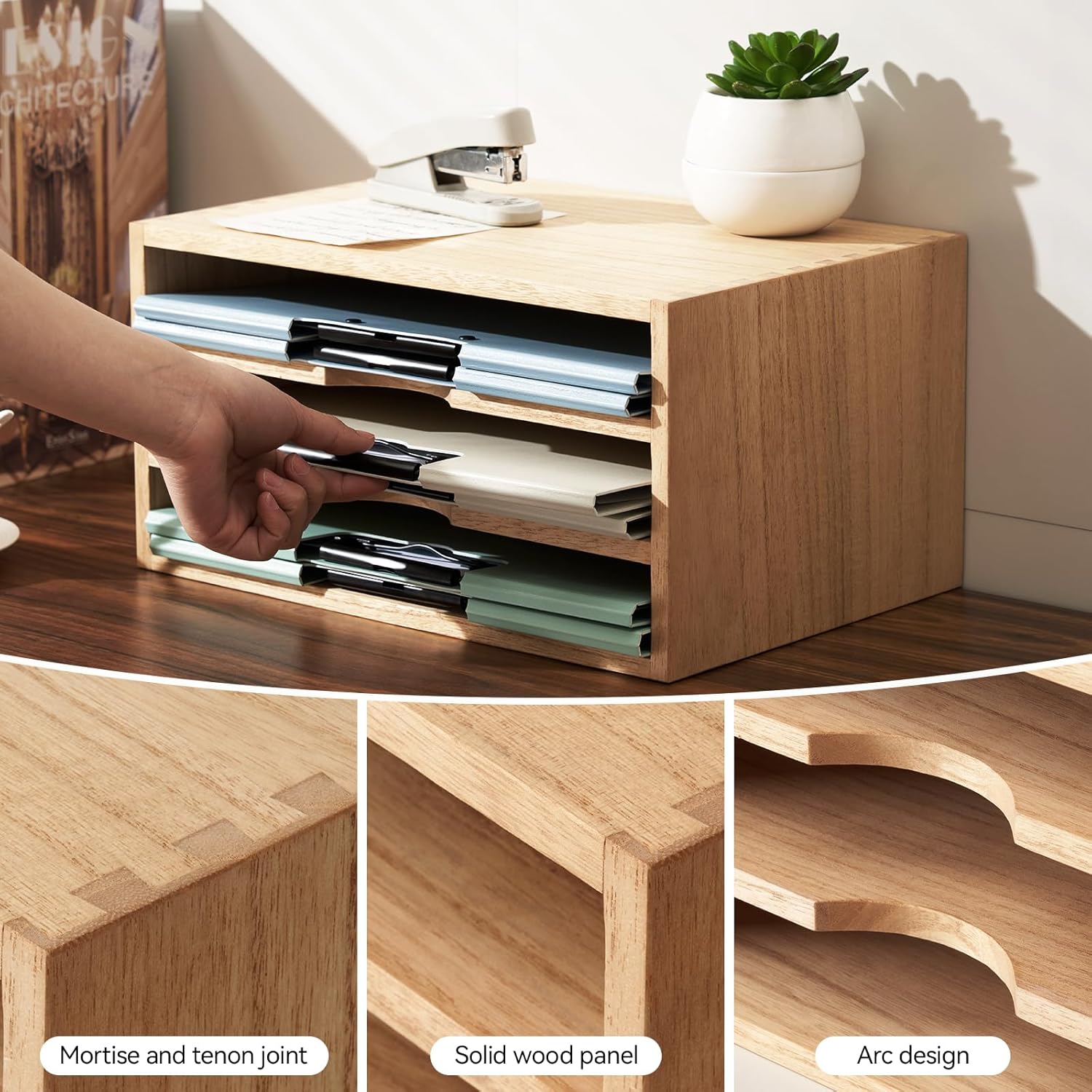 KIRIGEN Wooden Desktop Organizer Paper Storage Letter Tray File Sorter - Desk Rack Magazine File Dividers Holders for Home Office Accessories Wood Desk Cabinet with 3 Layer Trays Natural(3KWJG-NA)