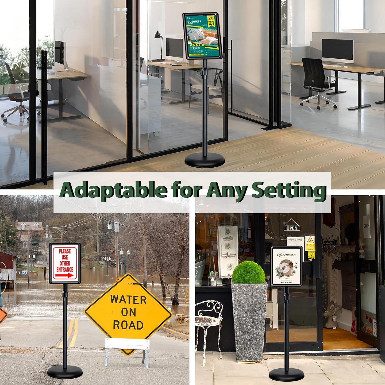 - ➽Sturdy & Stable: The material of the poster frame is aluminum and the material of the stand pole is stainless steel. Besides, you can add water and sand into the rubber base to increase stability.