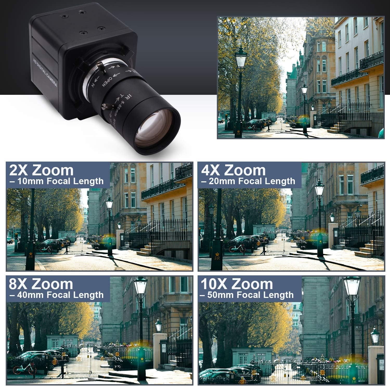 - CS Mount 5-50mm Varifocal Lens: 10X optical zoom webcam,standard CS mount lens can be changed. Manually adjustable focus and focal length for more applications, either close ups or long distance shots.Field of View: 15°-64°