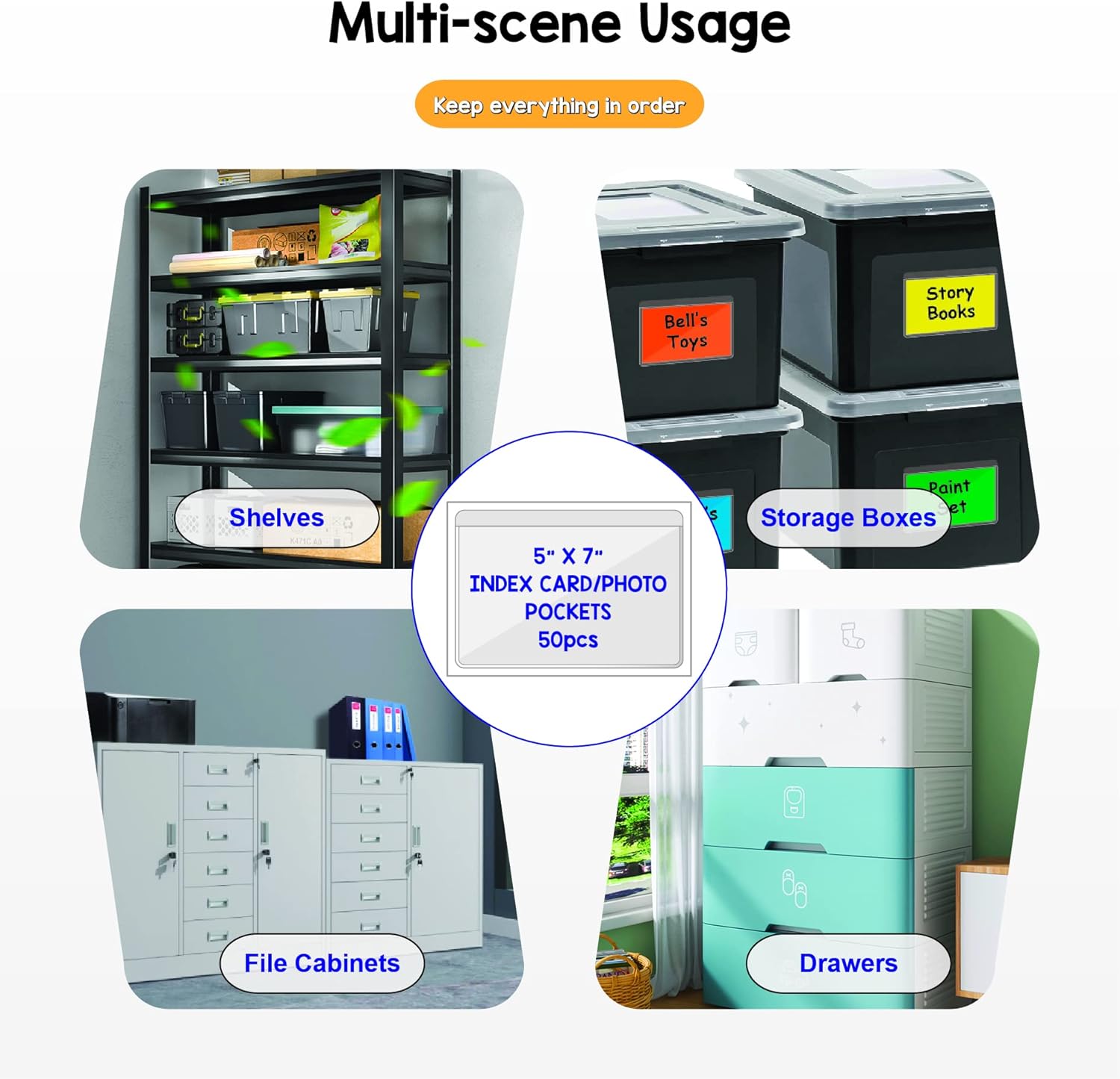 Clear Adhesive 5" x 7" Index Card Pockets with Top Open for Loading, 50 Pack, Plastic Labels Holders for Storage Bins and Library Card, Organizing and Protecting Your Index Cards or Photos