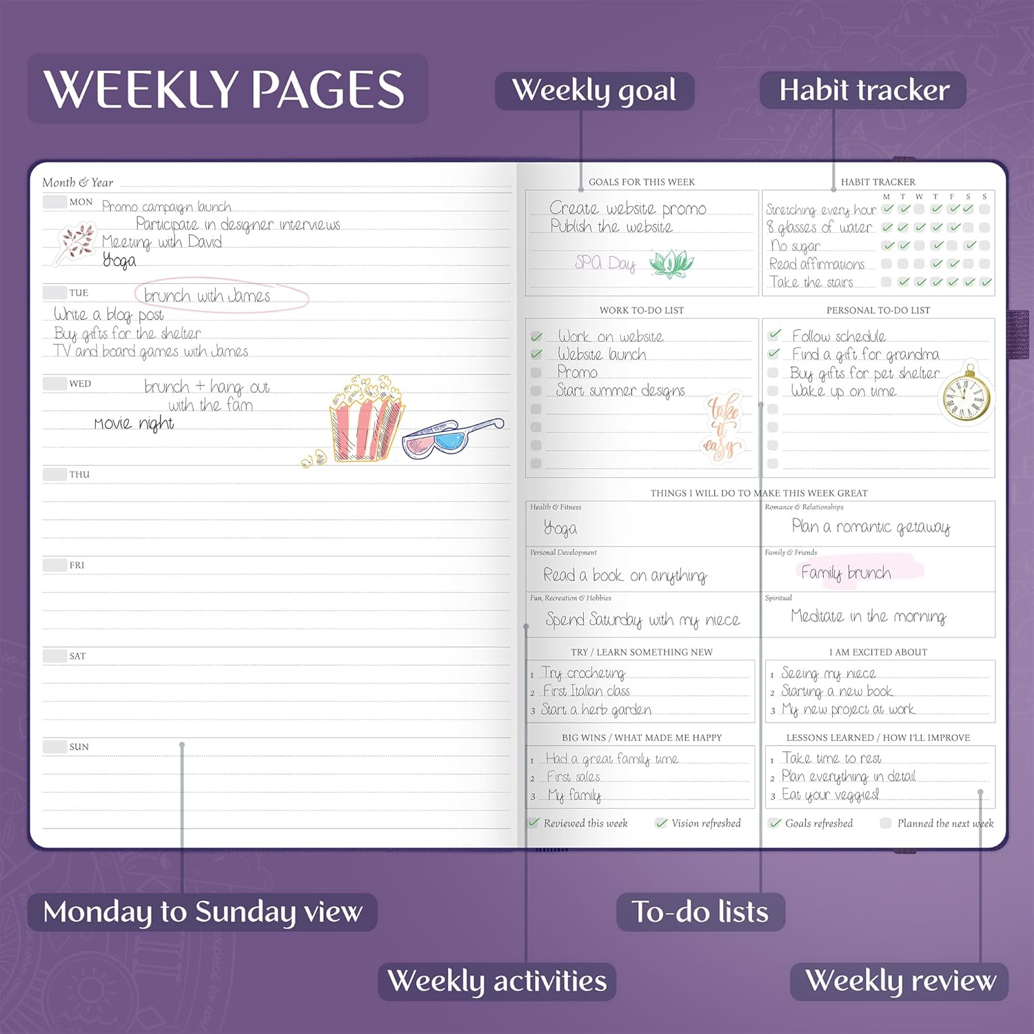 - MANAGE YOUR TIME, TO-DO'S & FINANCES ALL YEAR ROUND – Each week includes a Monday-to-Sunday layout, a habit tracker, and to-do lists. Each month features a spacious calendar, a budgeting section, and an expense tracker to stay on top of everything.