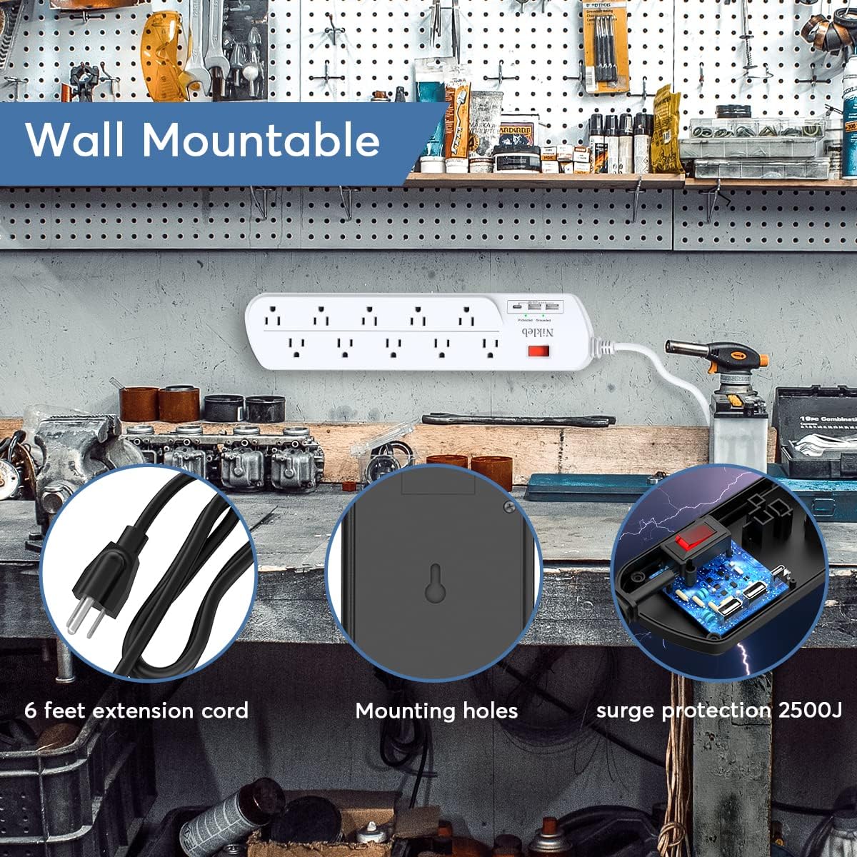 Long Power Strip, Multi Plug Outlet Extender Nikleb with 10 Outlets, Heavy Duty Extension Cord with 2 USB+1 Type C Ports, USB Plug Adapter Surge Protector for House, Garage, Patio, Basement