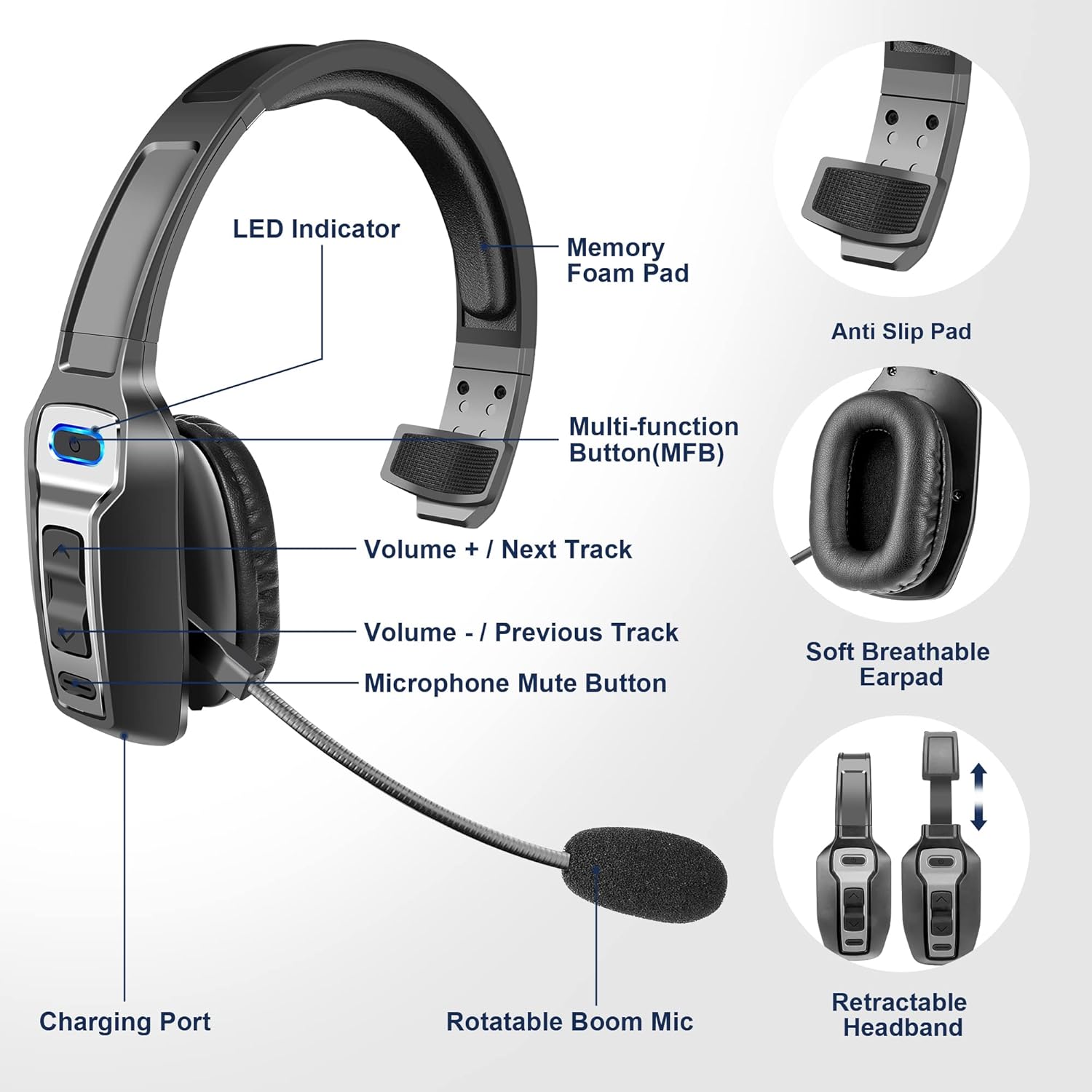 Trucker Bluetooth Headset, V5.2 Wireless Headset with Upgraded Microphone AI Noise Canceling, On Ear Bluetooth Headphone with Mute for Driver Office Call Center