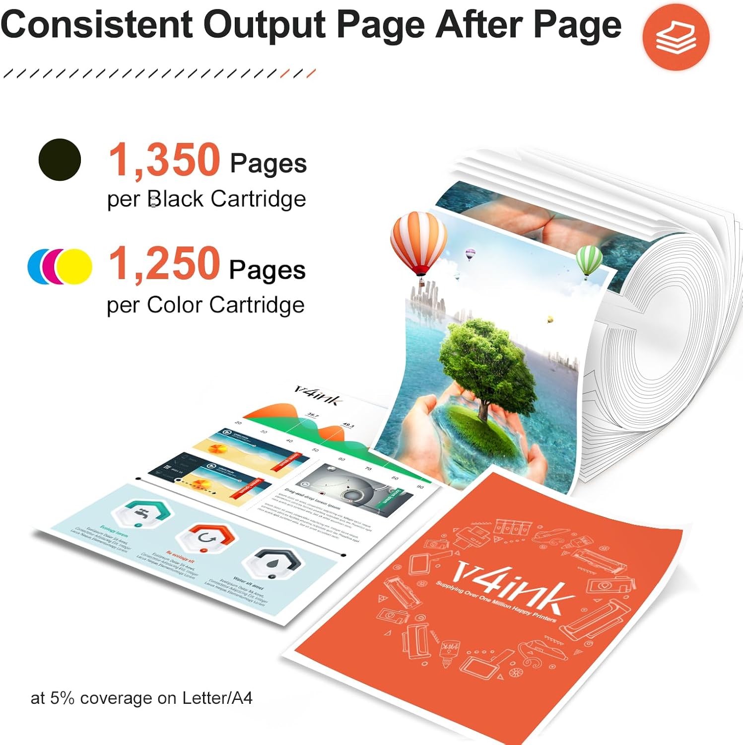 - Print more and cost less: 1,350 pages per Black cartridge and 1,250 pages per Cyan Yellow Magenta Cartridge at 5% coverage (Letter/A4).