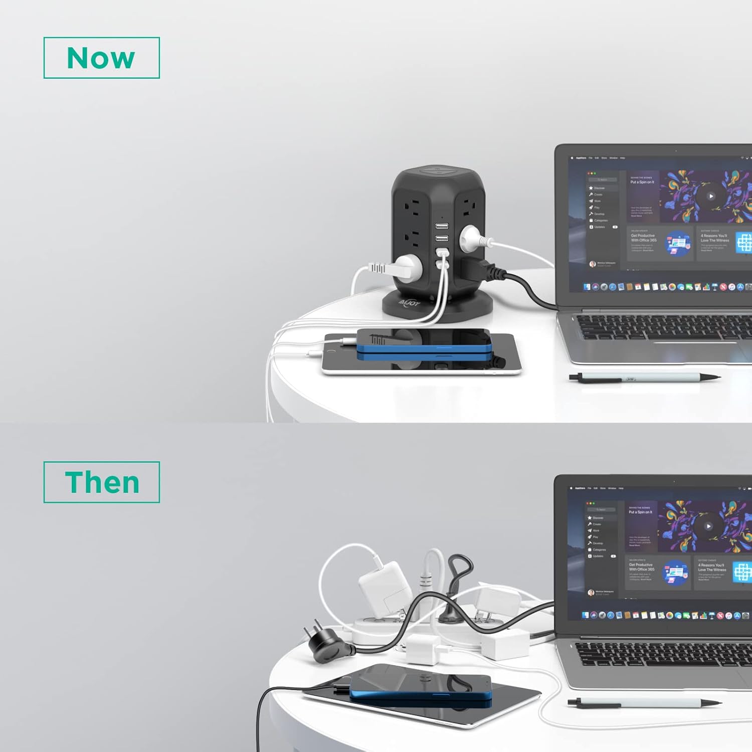 - 1200J Enhanced Safety Features: Power strip surge protector has passed FCC, RoHS certification, this surge tower has surge protection, overload protection, short circuit protection, lightning protection. The power tower charging station use the ceramic SPD to automatic cut off the power fastly when voltage surge is detected, to ensure you a safe charging environment; The power tower has a reset button, in case the maximum voltage is exceeded and the unit shuts down