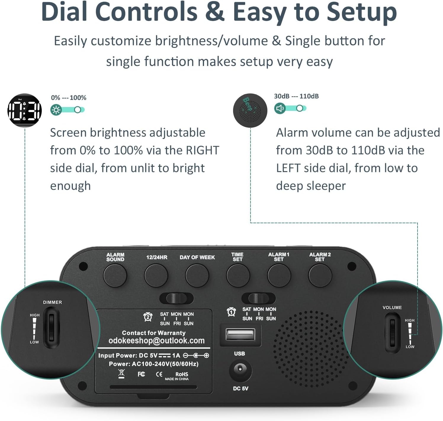 - EASY TO SETUP & 0-100% DIMMABLE DISPLAY - All buttons do one task and are clearly labeled makes setting the time or alarm extremely intuitive and straightforward. Large easy to read white LED digits(1.6-inch tall) that can be easily viewed from a distance and the brightness can be easily adjusted from very bright to fully dark with the simple dimmer dial, which is nice for sleeping so you don't have a bright light in the room. 12 or 24 hour time display optional.