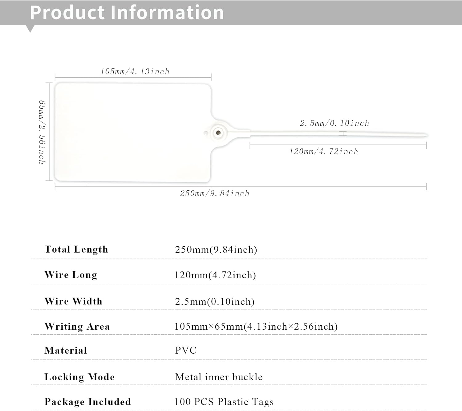 - 1. Specification: Plastic Label Tag Size: 105*65 mm/4.13"*2.56", available locking length: 148mm/5.83", Material: High Density Polypropylene.