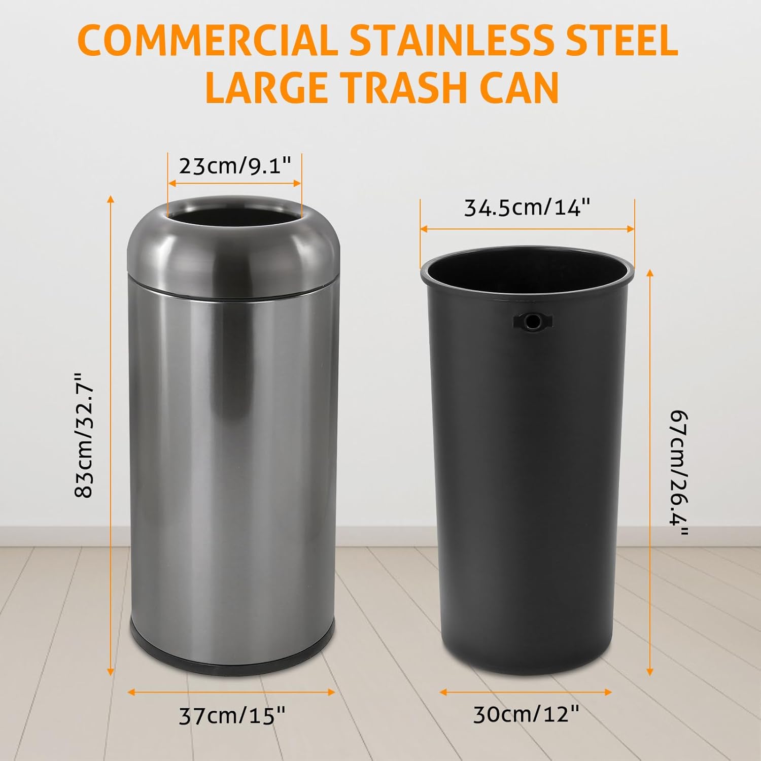 - Spacious 16-Gallon Capacity – This extra-large stainless steel trash bin (32.67" tall, 14.56" diameter) offers ample space for high-traffic areas like hotel lobbies, banquet halls, supermarkets, restaurants, and homes, reducing frequent bag changes