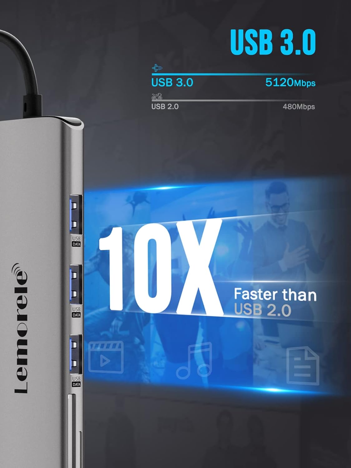 - 【8-in-1 USB C Hub】 Lemorele USB C Hub is equipped with all the necessary functionsyou’re your daily life and general work, including 1x 4K@30hz HDMI port, 1x100w PD charging port, 1x USB 3. 0 Type A data ports, 2x USB 2. 0 Type A data ports, 2x SD&TF card slots, 1x USB Type-C.