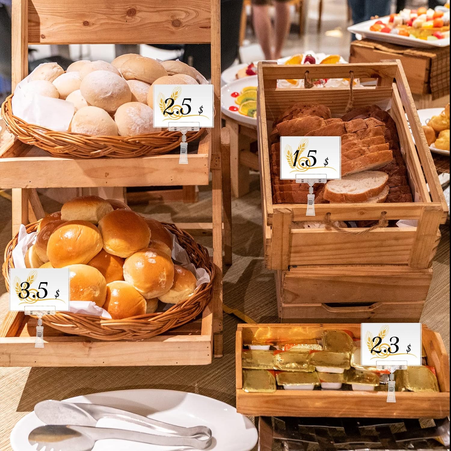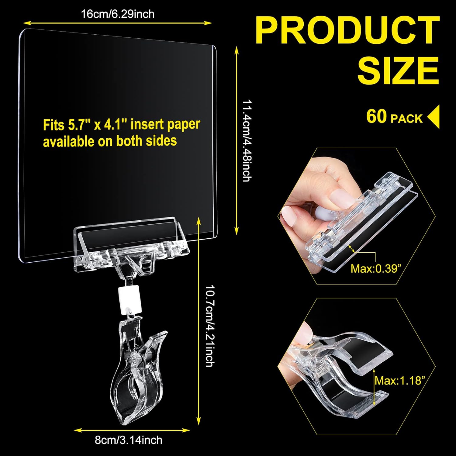 - Size and Material: our clear food signs clip are made from plastic, the size measure about 3.15 x 4.33 inches, can be rotated to 90 degrees or 360 degree;And the sign holders are made of PVC, 6.3 x 4.41 inches, fit 5.5 x 4.1 inch paper inserts