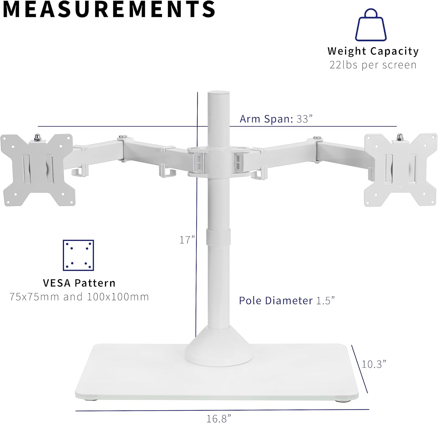 - Strong and Balanced Tempered Glass Base: Provides extra support and increases stability for dual-screen setups. The rectangular glass base measures 15.2” x 10.2" and features bottom-side padding. The pole and arms are made of steel