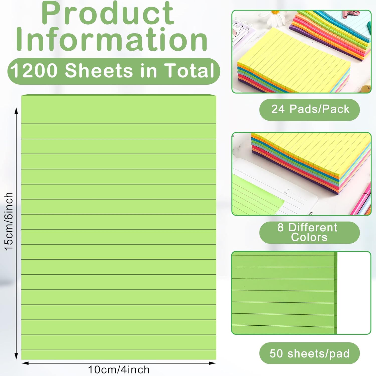 24 Pack Lined Sticky Notes 4 x 6 Inch Colorful Sticky Note Pads with Lines Bright Ruled Self Sticky Notes Memo Pad for Office Home Supplies, 50 Sheets per Pad, 1200 Sheets, 8 Colors