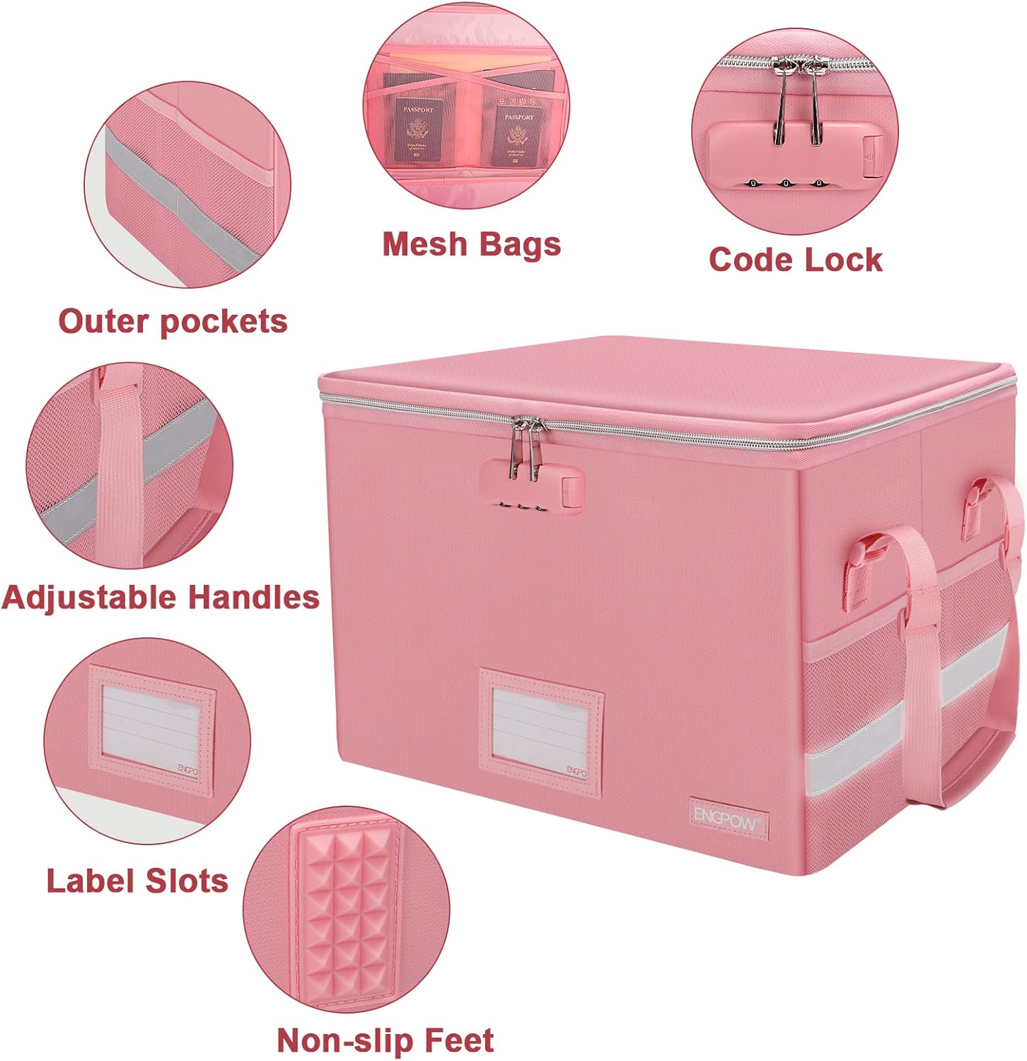 ENGPOW File Box with Lock, Fireproof Document Box with Zipper&Pockets, Collapsible File Organizer Filing Storage Cabinet with Handle, Portable Home Office Safe for Hanging Letter/Legal Folder, Pink