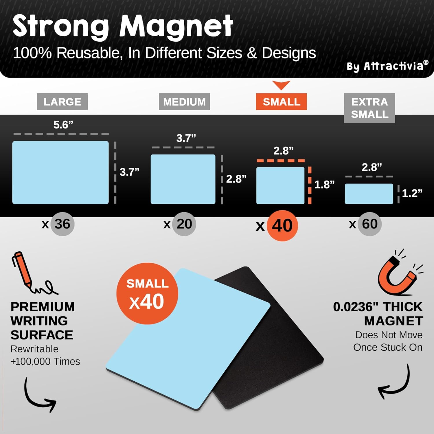 - Strong Magnetic Hold: Our dry erase magnets feature a powerful 0.02 inch thick magnetic back for instant and secure adhesion to any metallic surface, whether flat or slightly curved. Easily attach our dry erase stickers labels and remove without residue, ensuring a firm grip even on rounded surfaces.