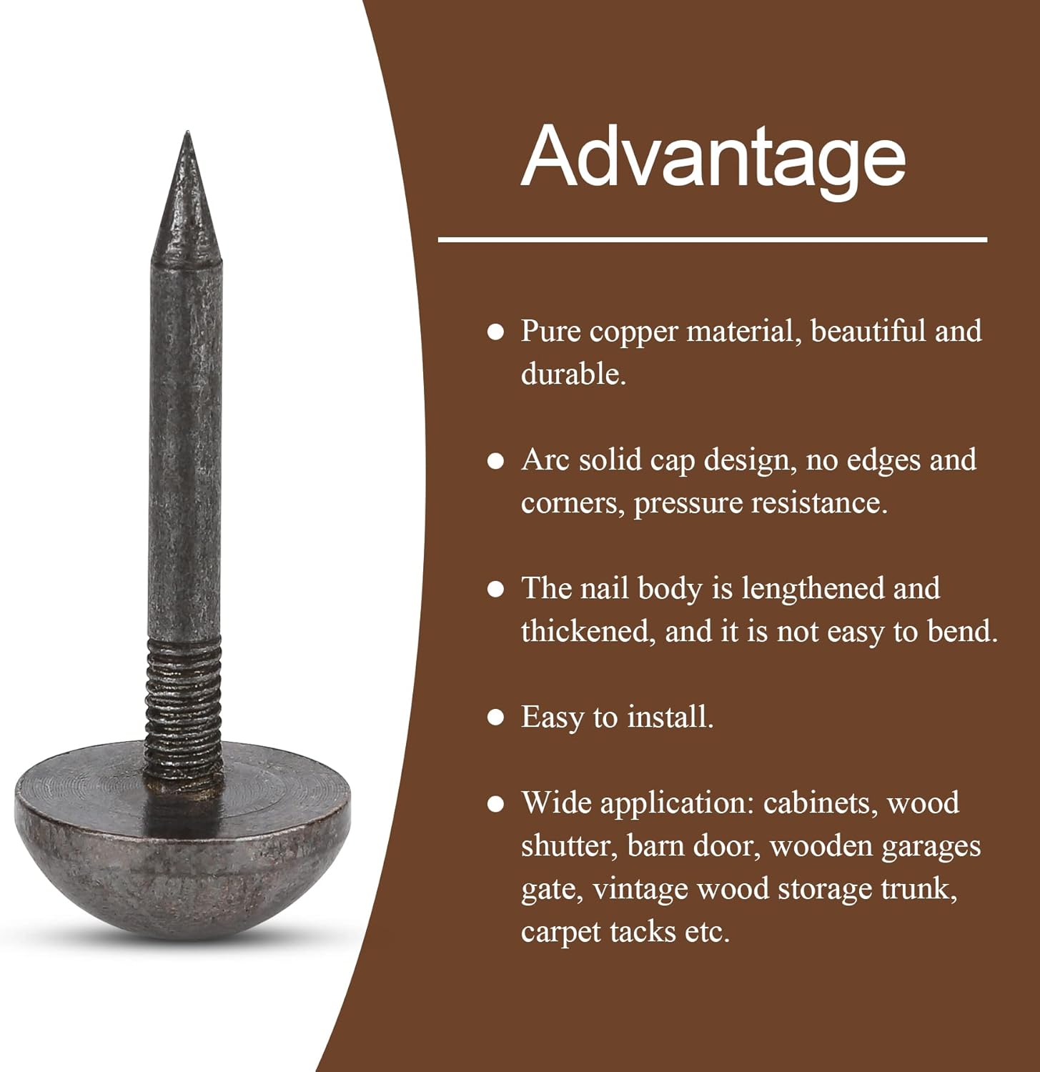 - 【Design】 The solid pure copper texture decorative nails is virtually maintenance free and is permanent.Cap nails body in thick design,will not break or bend for rustic wood furniture in your home or offices.