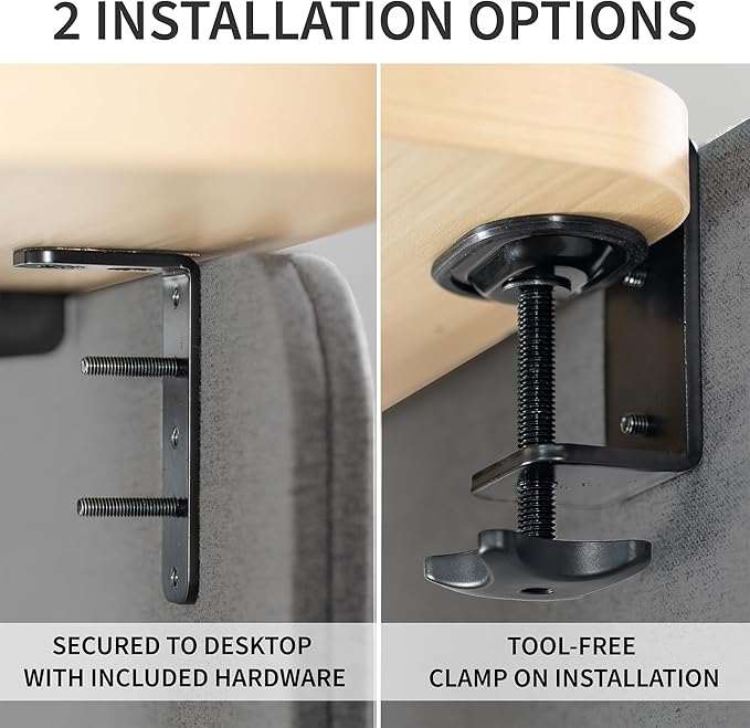 - Sturdy Desk Clamps: Clamp these panels to your desk (0.4” to 1.4” in thickness) for a secure, yet flexible setup. The clamps are easy to install for convenient placement, and spacers are included to allow room for cable routing and monitor mounts
