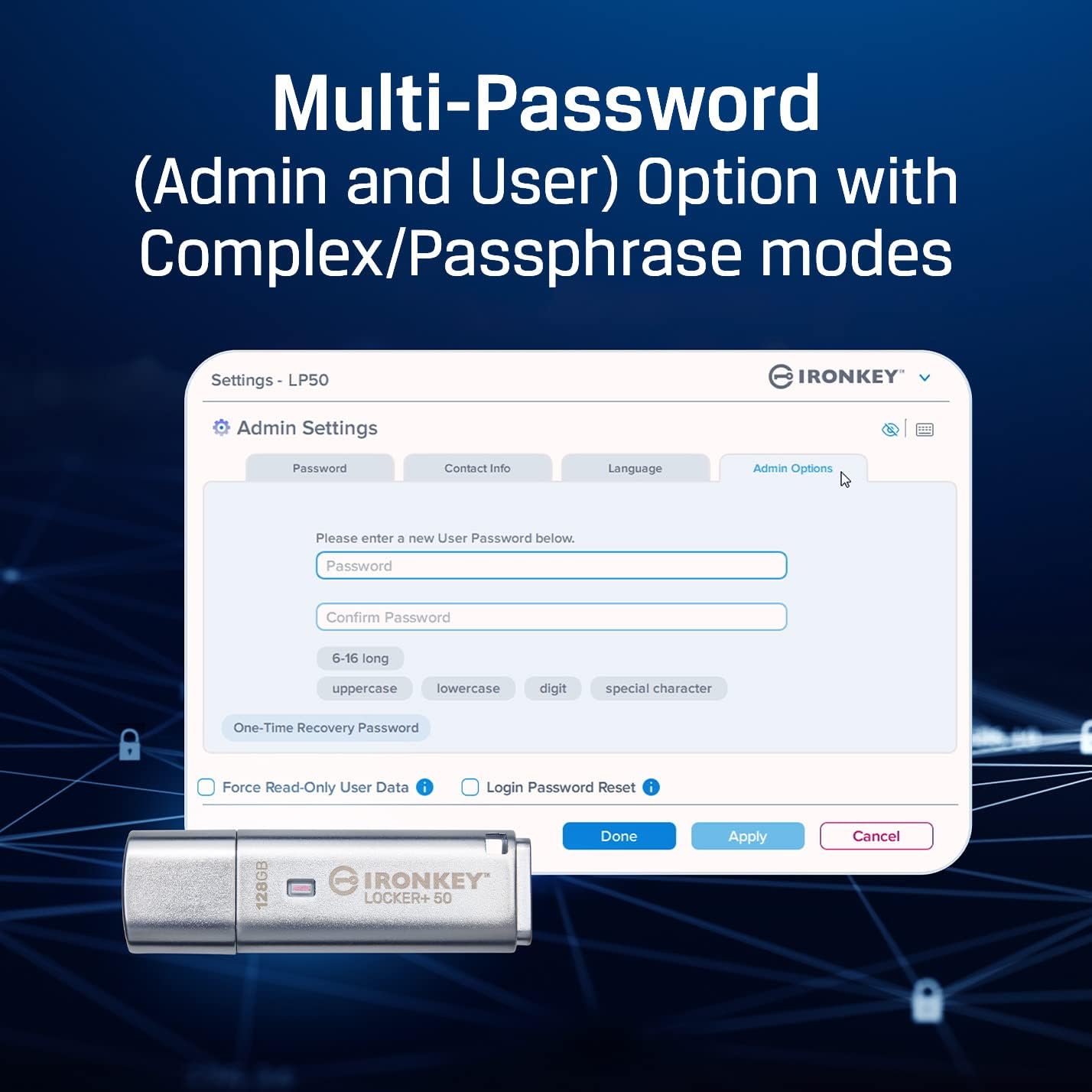 - Multi-Password (Admin and User) Option with Complex/Passphrase Modes