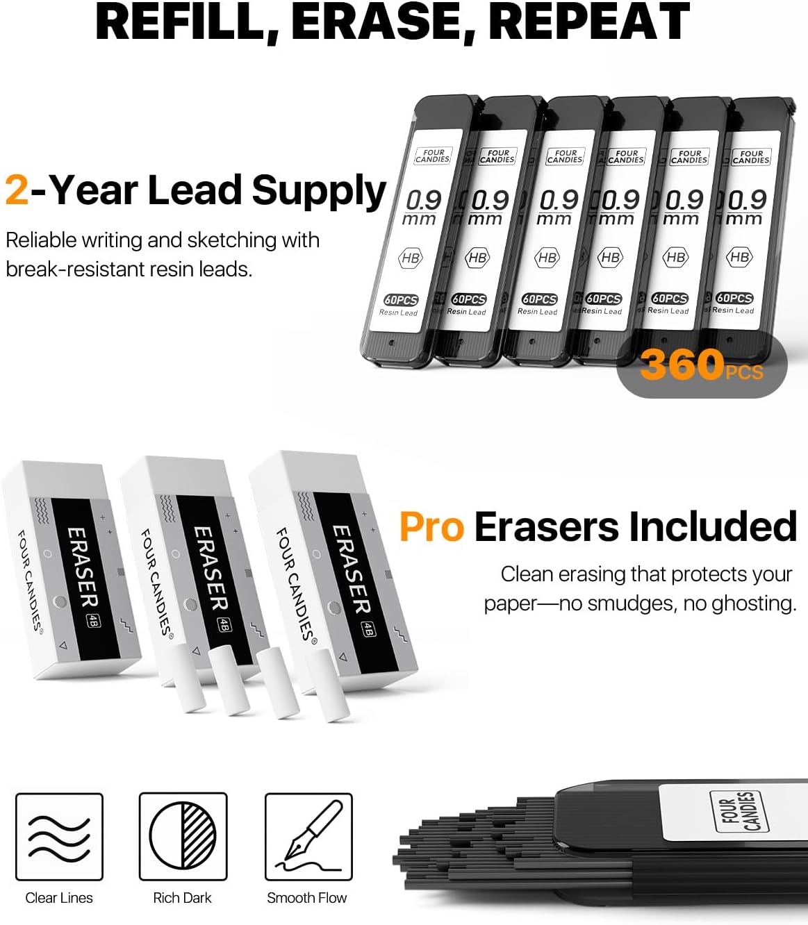 Four Candies Metal Mechanical Pencil Set - 3PCS 0.9mm Art Mechanical Pencils & 360PCS HB Lead Refills & 3PCS Erasers & 9PCS Eraser Refills, Drawing Mechanical Pencils for Writing, Sketching/With Case