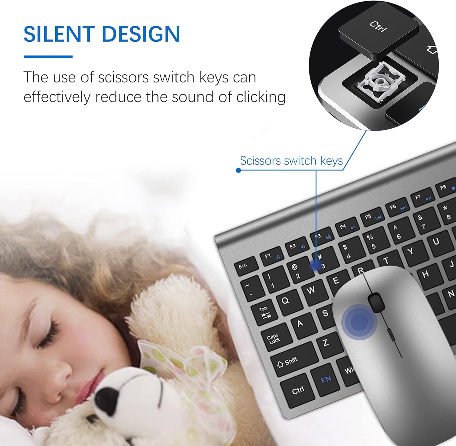 - 【Teclado silencioso y mouse de 5 DPI】Las teclas de interruptor de tijera del teclado de oficina inalámbrico brindan menos ruido. La pulsación de teclas táctiles ligeras y sensibles hace que escribir sea suave y cómodo. El mouse inalámbrico silencioso tiene 5 niveles de DPI (800/1200/1600/2000/2400), lo que le permite ajustar la velocidad de DPI a su preferencia. Es rápido y preciso, se mantiene silencioso mientras mantiene la sensibilidad. Nunca se preocupe por molestar a los demás para que descansen mientras trabaja o juega.