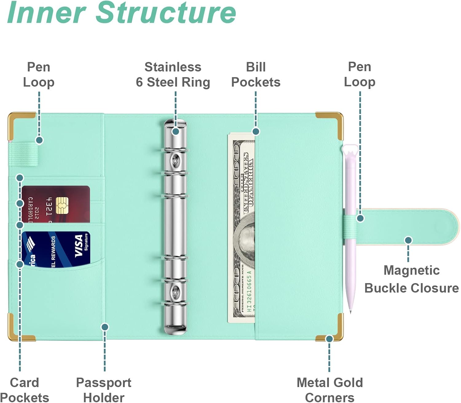 - Practical A6 Money Binder: Cash envelopes binder measures about 7.5 x 5.1 inches. Made from water-resistant PU leather, designed with attractive illustration and gold metal trim that protect corners from wear, balance between aesthetics and utility