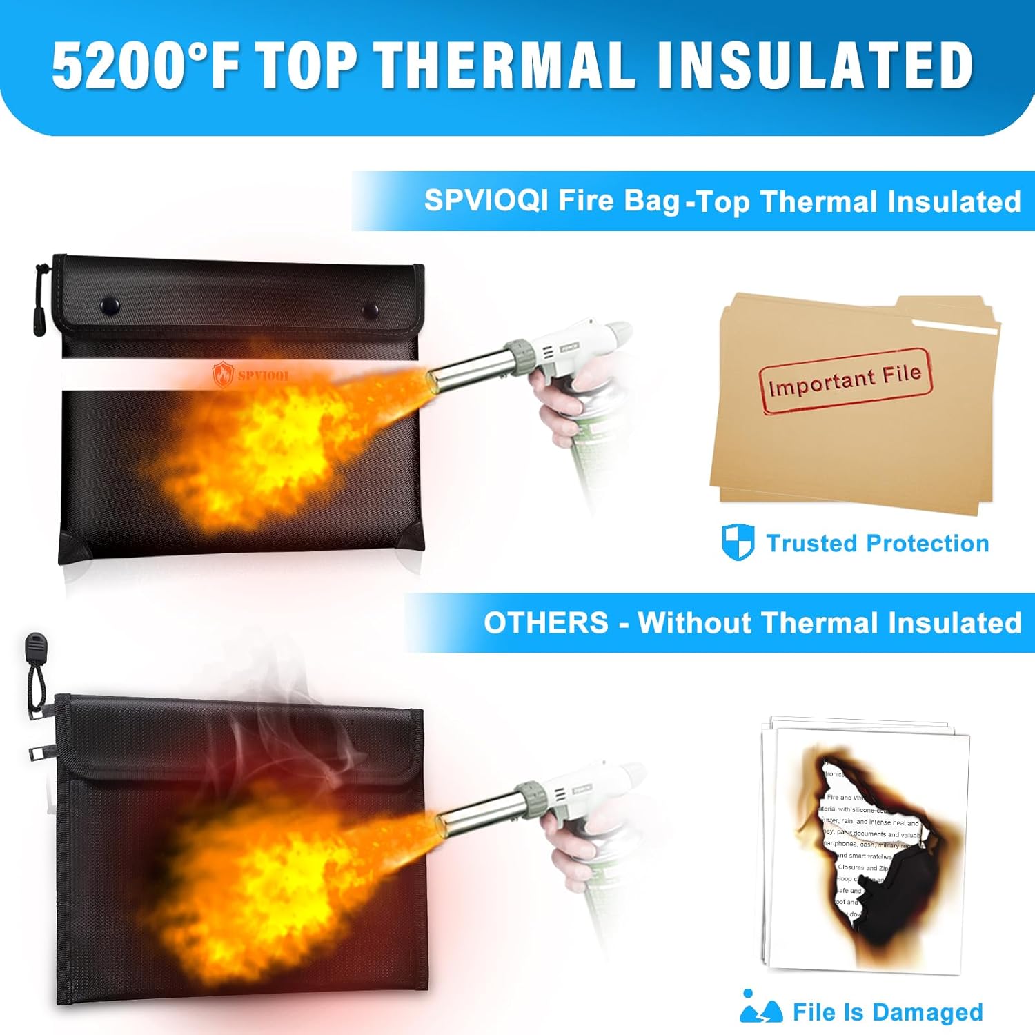 - 5200°F TOP FIRE PROTECTION: The Upgraded SPVIOQI fireproof money bag has passed Global Flammability Standards (US labs) and Vertical Combustion Testing (SGS UL94 V-1); Recommended by professional firefighters and tested in the most demanding environments; The fire proof bag can withstand ultra high temperatures up to 5200°F; It is worth mentioning that the reflective strip of fire bag has high visibility at night, which is convenient for you to quickly find in a fire