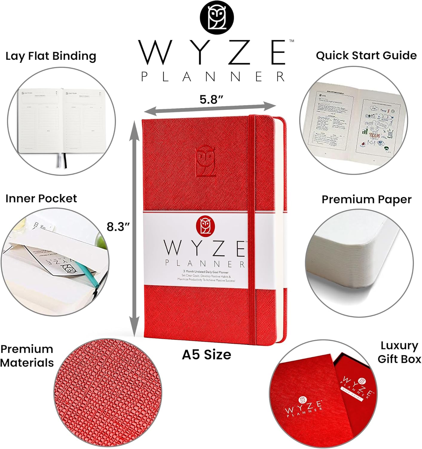 Undated Daily Planner – 3-Month A5 Productivity Organizer with Full Page Per Day, Hourly Schedule, Goal Setting, Habit Tracker, Weekly & Monthly Pages – Hardcover Time Management Notebook (Red)
