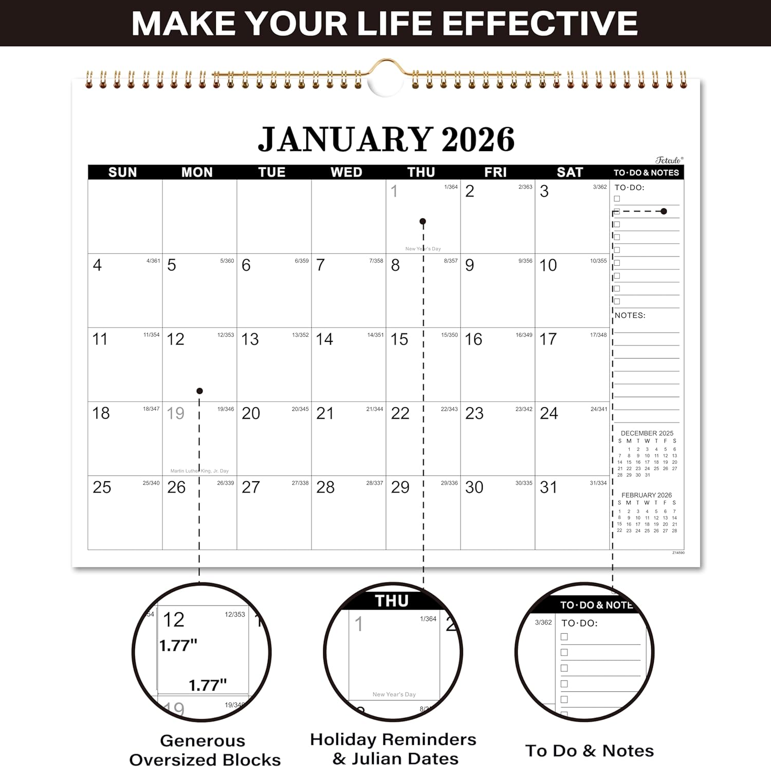 - 🖋 2026 Calendar Monthly Page - Each page of this 18-month calendar has Large Daily Blocks (1.77'' x 1.77''), Notes Section, To-Do List for you to itemiz your monthly goals and important things. Besides, Highlighted Holidays and Julian Dates can inform you to arrange the holidays in advance and know the passed and the remaining days of the year.