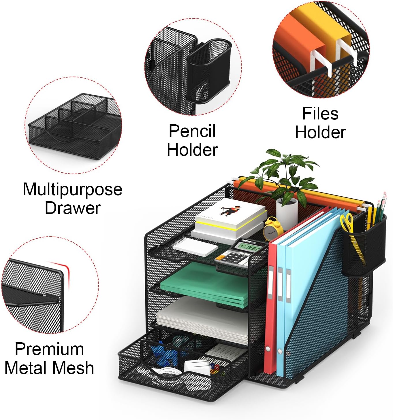 Desk Organizer with Hanging File Holder, Paper Letter Tray Organizer with Drawer and Pen Holder, Mesh Desktop Organizer and Storage for Office Supplies(Black)