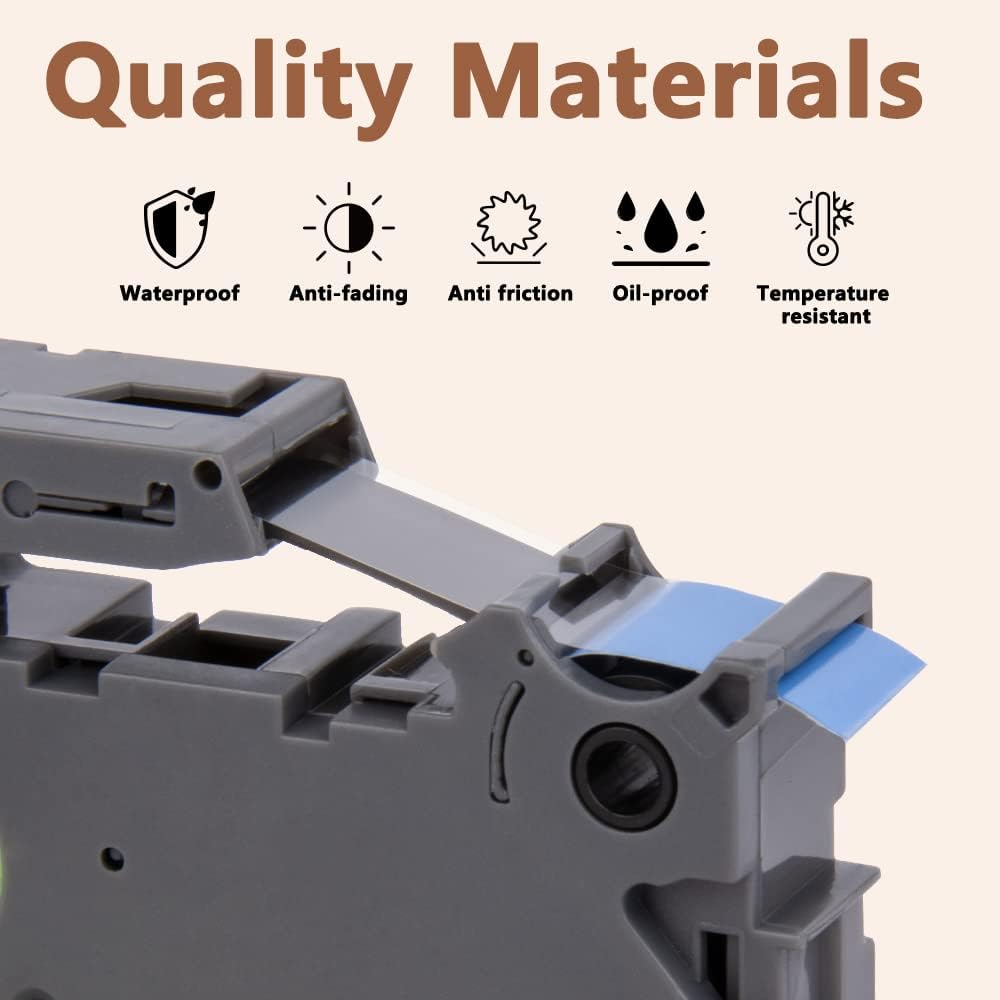 - Product features : Split back, water resistant, fading resistant, abrasion resistant, temperature resistant, strong adhesive. This compatibel 12mm tze-531 Black on Blue label tape is suitable for indoor and outdoor use