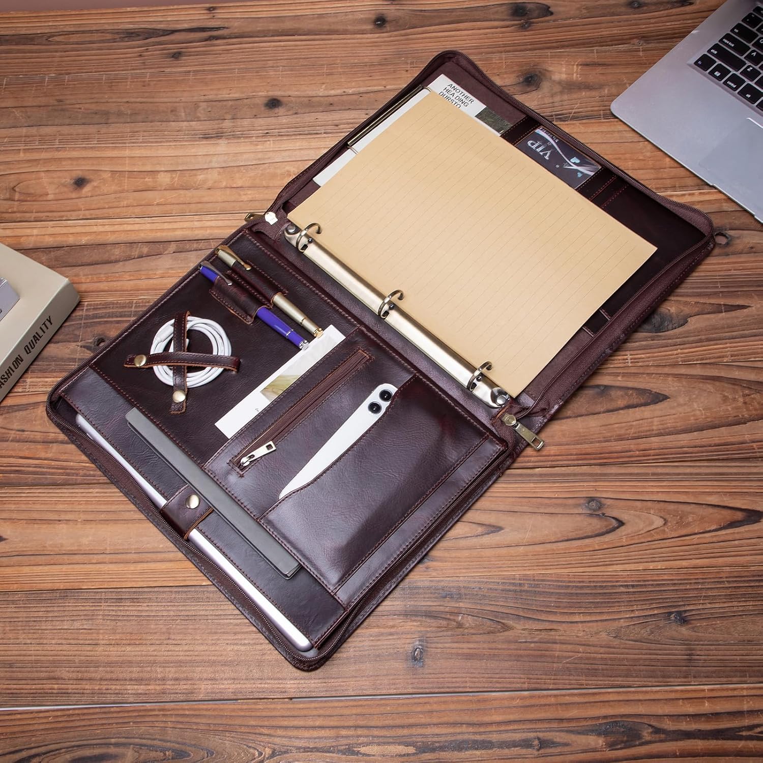 Genuine Leather Portfolio 3 Ring Binder with Clipboard, Hidden Handle, 8.5 x 11 Zippered Padfolio, Business Organizer Professional Executive Folio for Men and Women, Dark Brown, Oil Tanned
