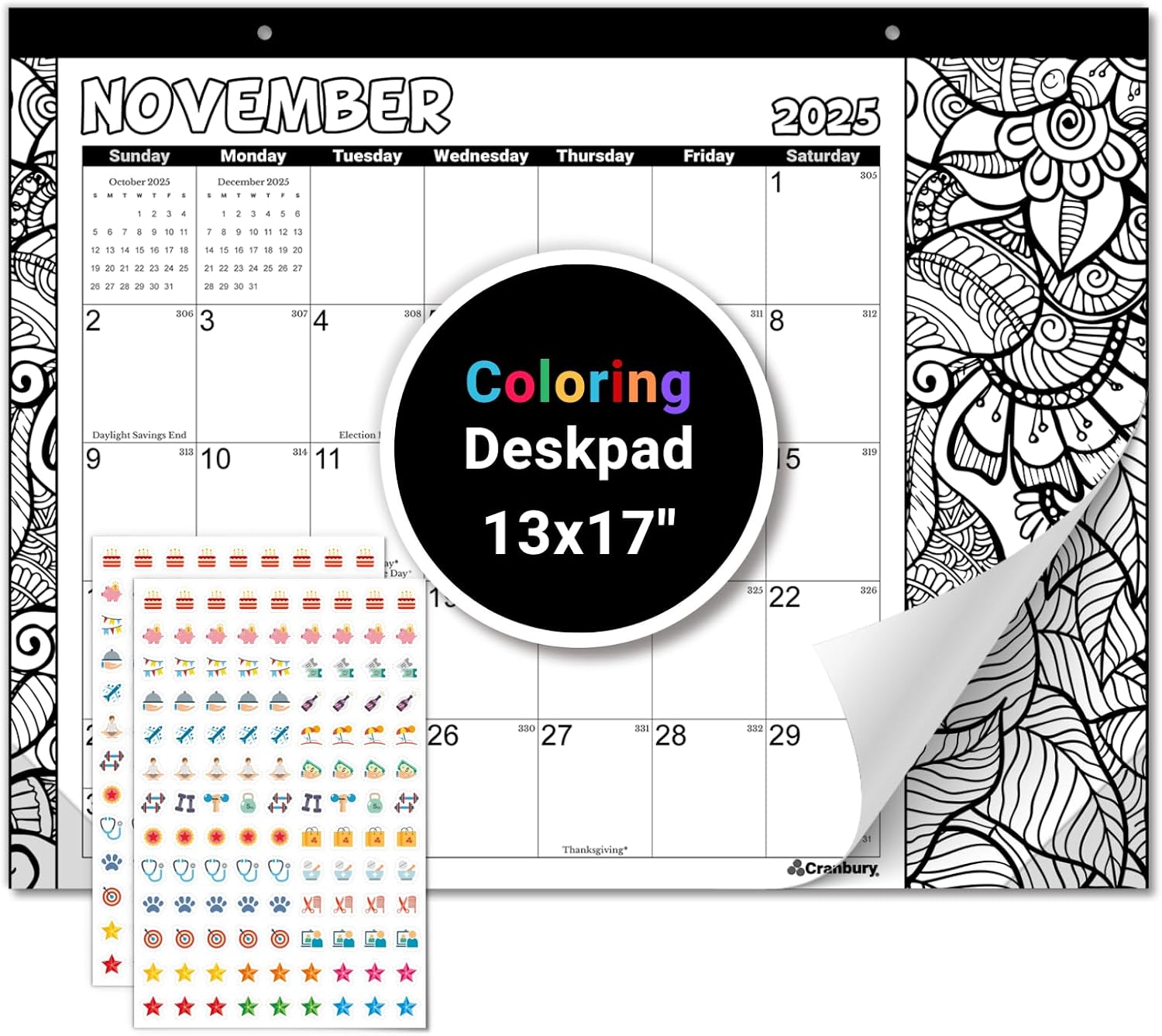 CRANBURY Coloring Desk Calendar 2026, 13.25x17" Doodle Deskpad Calendar or Large Hanging Wall Planner, Includes Planner Stickers, 14 Months, Use Nov 2025 to Dec 2026