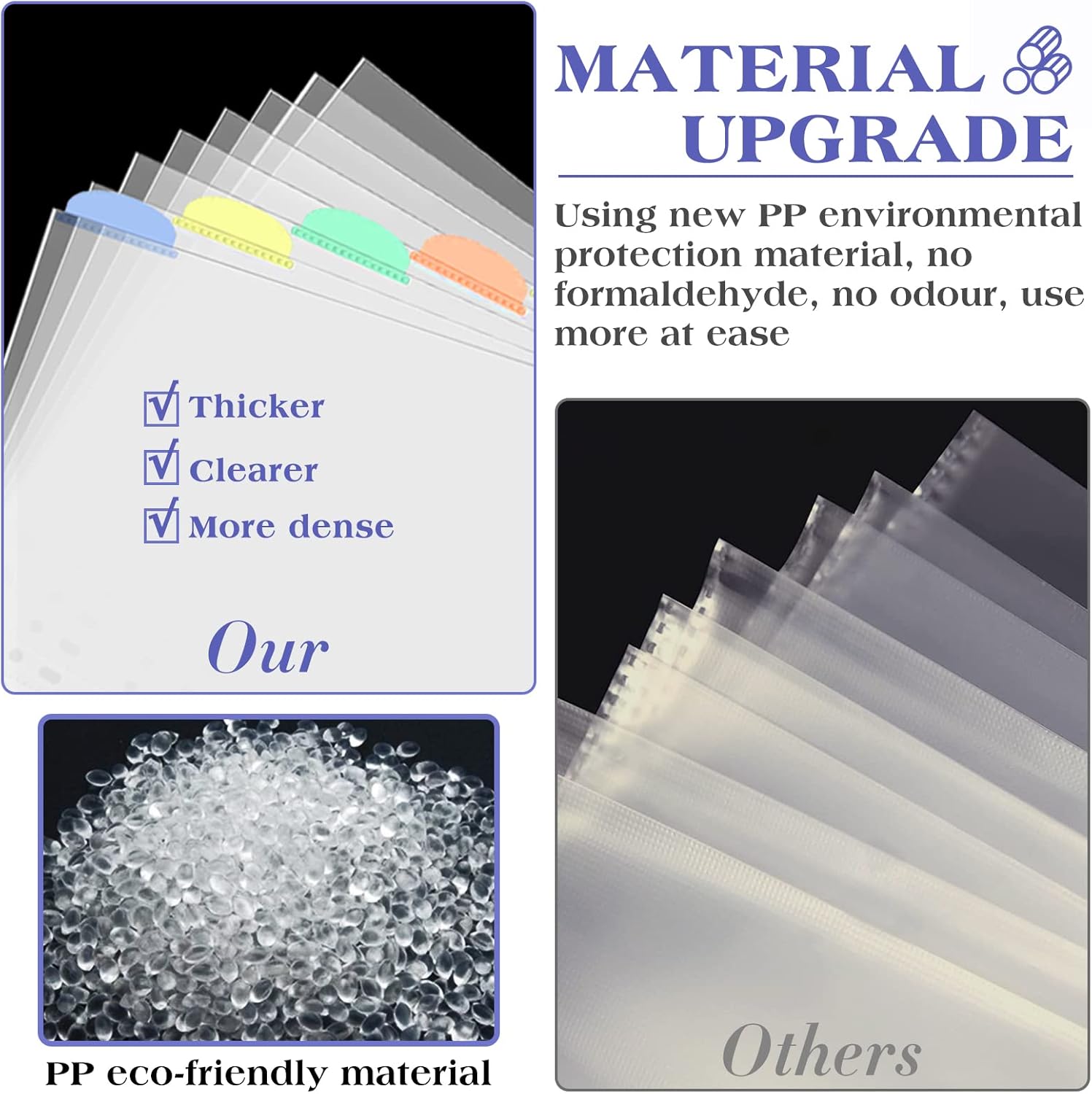 - HIGH QUALITY---Our sheet protectors are PP material, acid free, odor free and made of environmentally safe recyclable polypropylene, ideal for long-term storage.Top loading sheet protectors have clear finish providing optimum clarity for easy viewing of the documents.