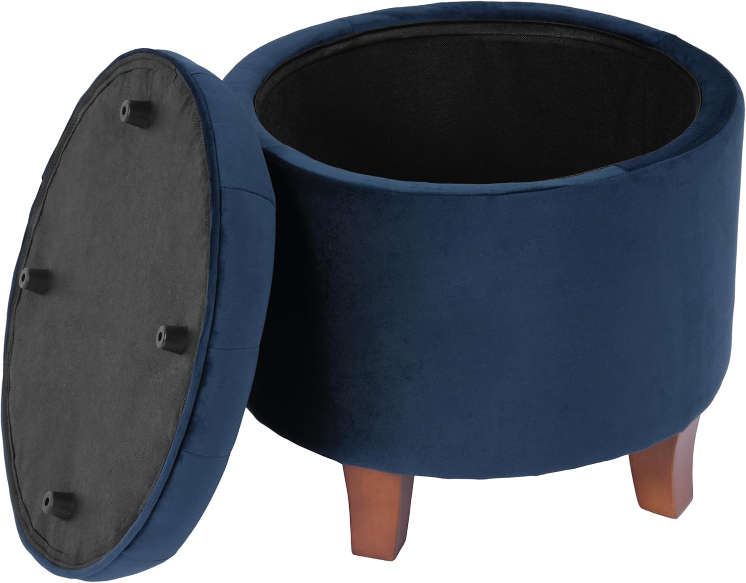 HomePop by Kinfine Fabric Upholstered Round Storage Ottoman - Velvet Button Tufted Ottoman with Removable Lid, Navy Blue
