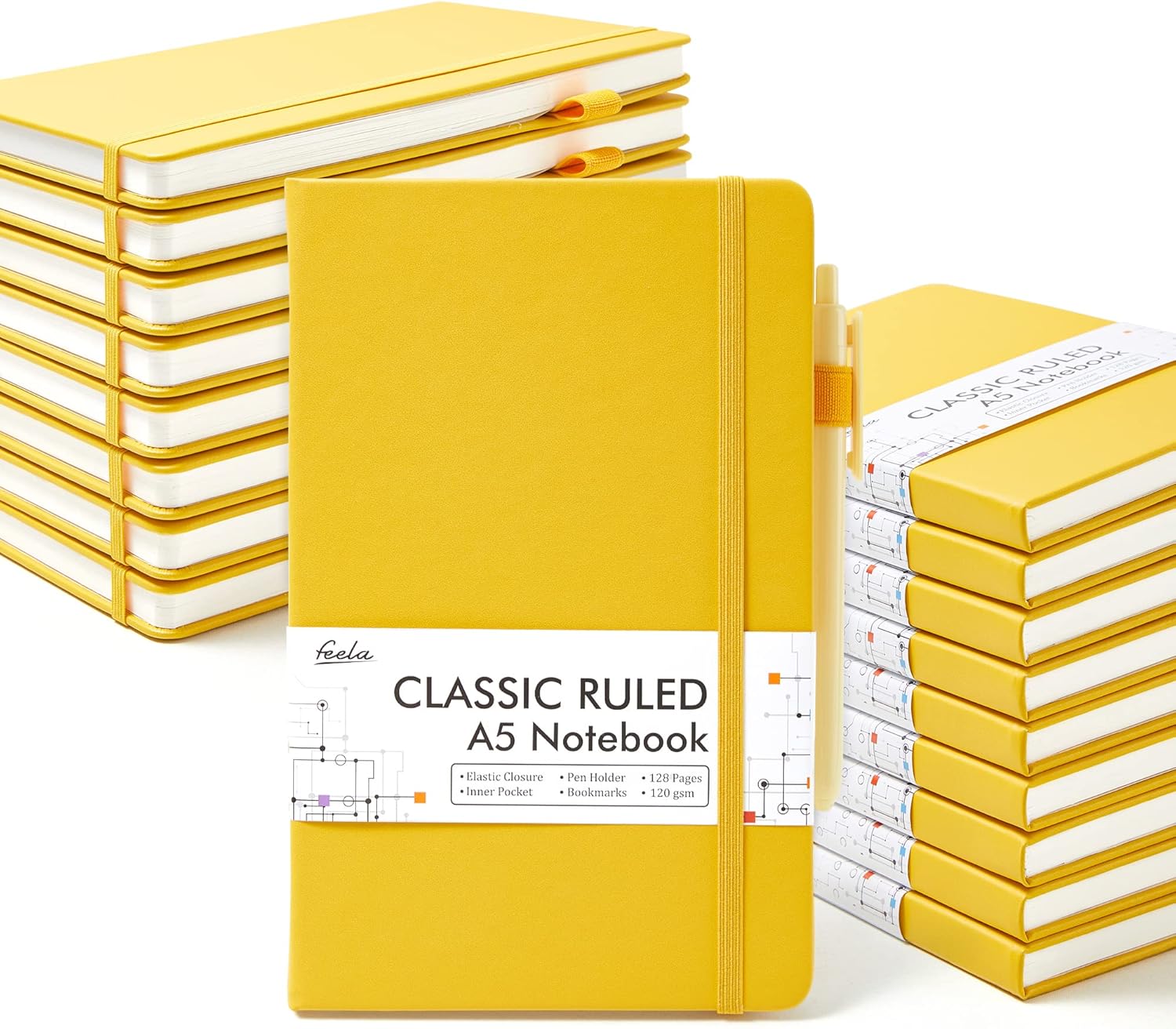feela 18 Pack Journal Notebook for Work, Business Notebook Bulk Hardcover Lined Writing Journal with Pen Holder for Men Women Note Taking, with 18 Black Pens, 120 GSM, 5.1”x8.3”, A5, Yellow