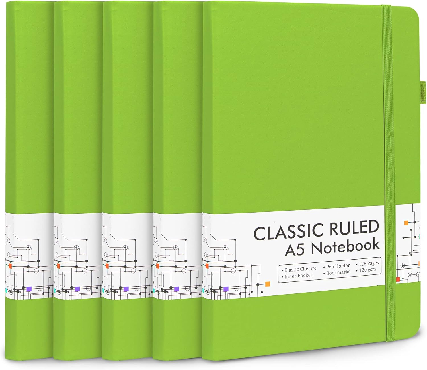 feela 5 Pack Notebooks Journals Bulk, Hardcover Notebook Classic Ruled Lined Journals with Pen Holder for Women Girls School Business Supplies, with 5 Black Pens, 120 GSM, 5.1”x8.3”, A5, Green