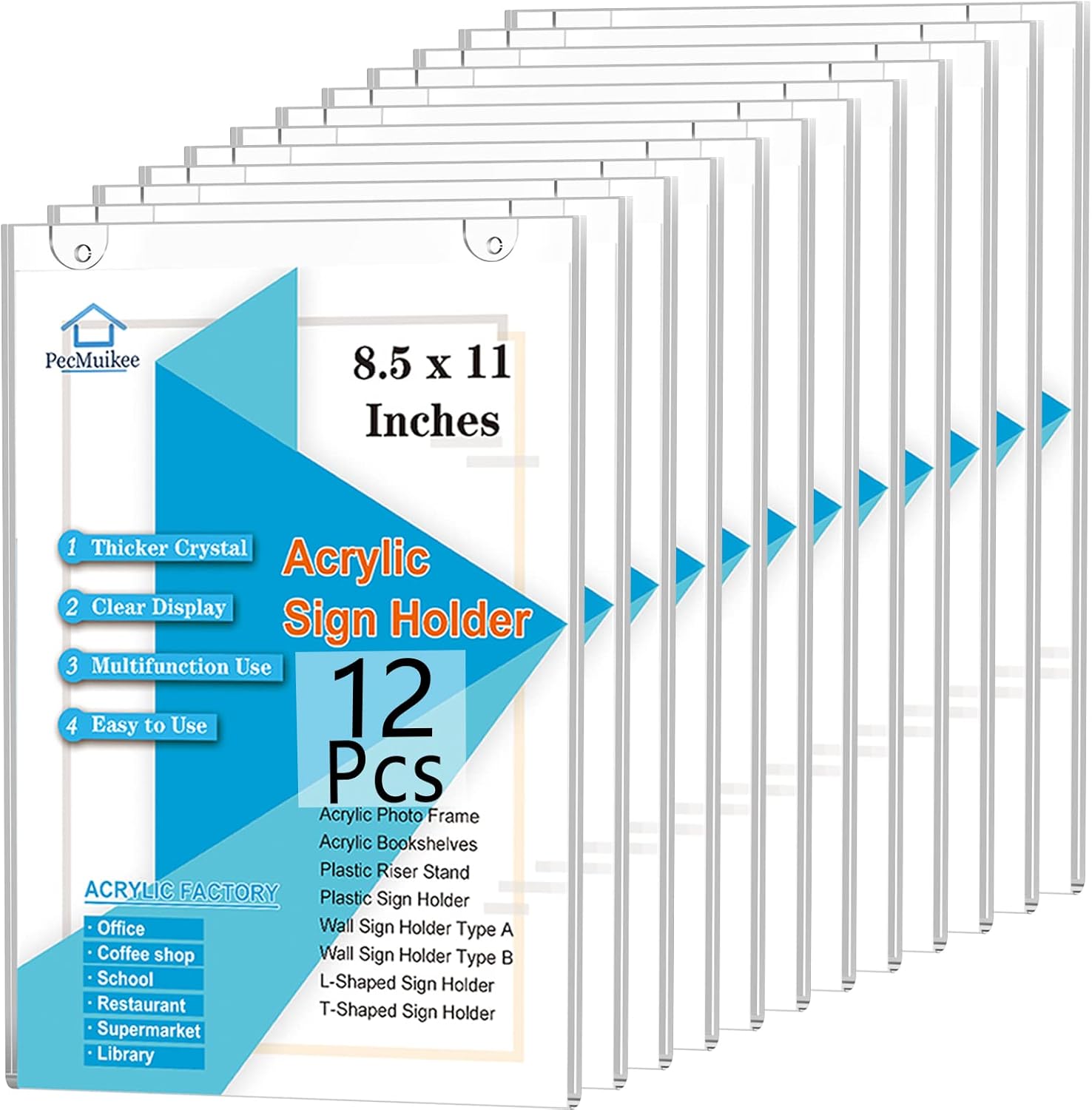 PecMuikee Acrylic Sign Holder 8.5x11, Wall Mount Acrylic Sign Holder and Plastic Paper Display Ad Frame bonus with 3M Tape and Mounting Screws for Restaurants, Office, Market, Library, Store, 12 Pcs