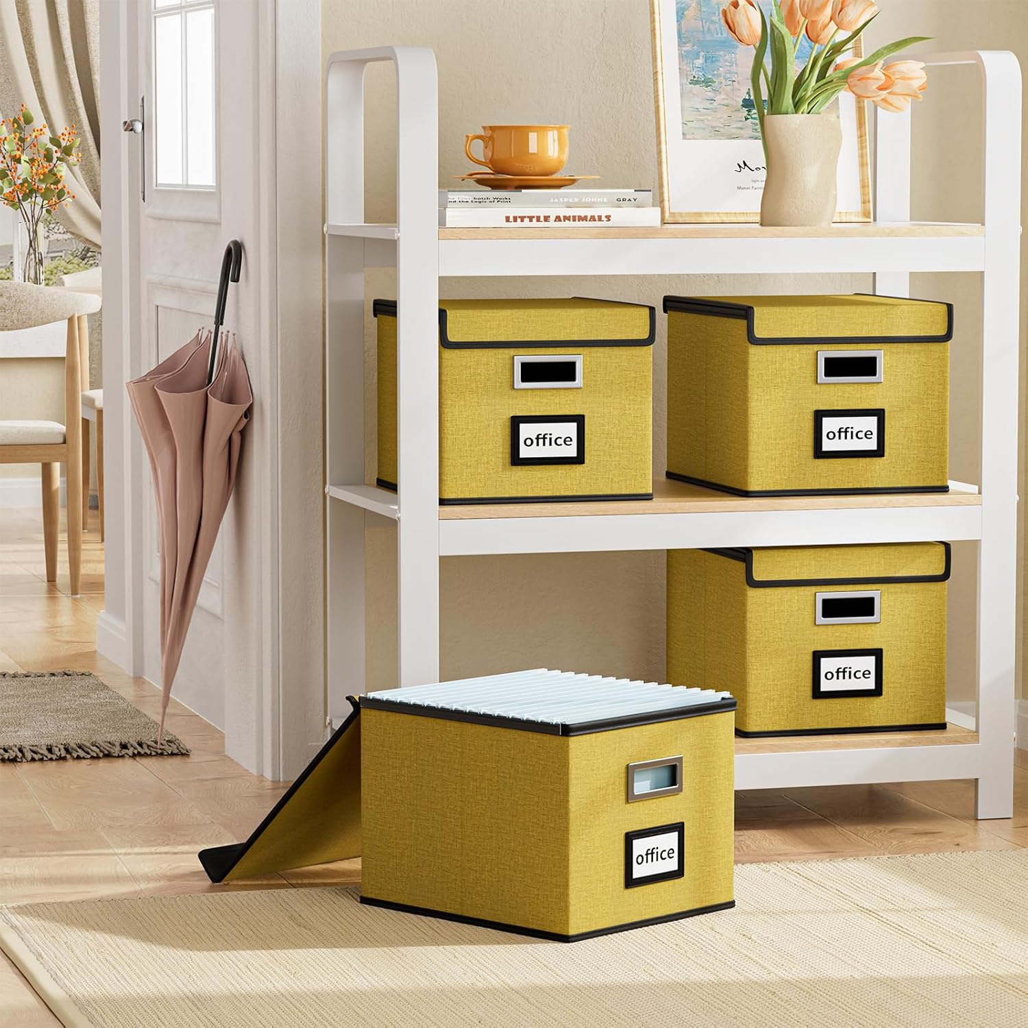 Huolewa Collapsible File Storage Organizer Box with Lid, Linen Document Storage Organization, Universal Hanging Filing Box for Letter/Legal Folder, Decorative Office/Home File Bins - yellow, box only
