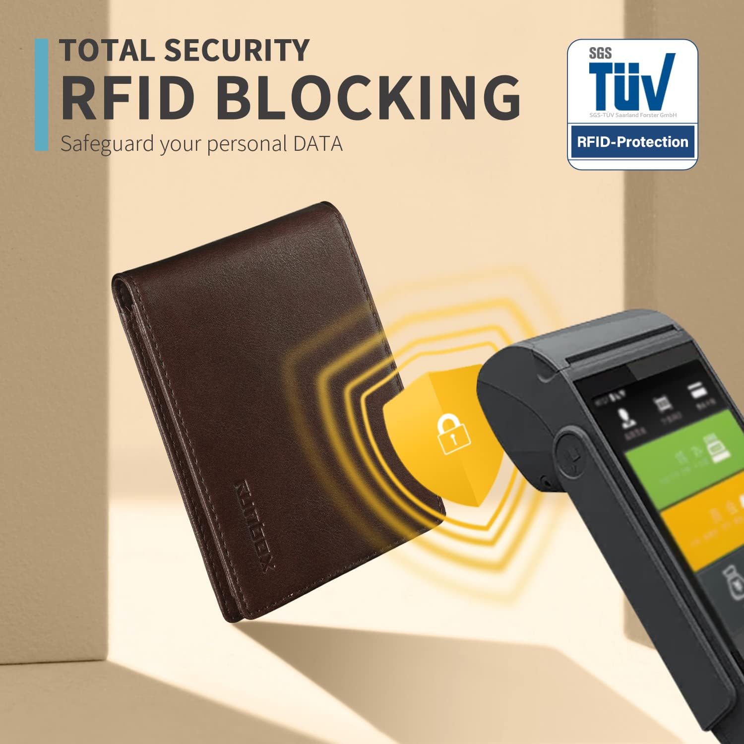 - RFID Blocking - Our wallets are equipped with advanced RFID SECURE Technology, a unique metal composite, engineered specifically to block 13.56 MHz or higher RFID signals and protect the valuable information stored on RFID chips from unauthorized scans. License and ID cards will be protected effectively. Blocking the 13.56 MHz band and protect against data theft by RFID scanners