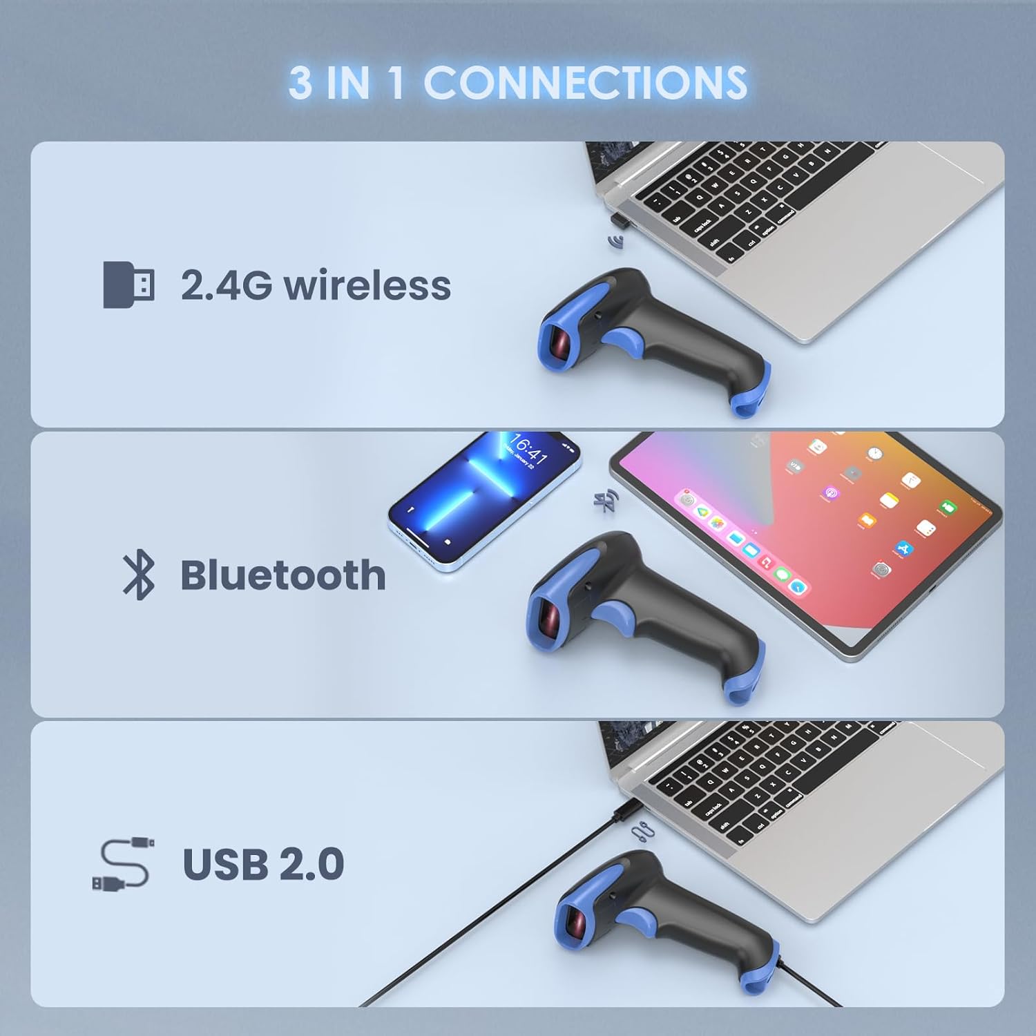- Wireless & Bluetooth & USB: To create the best scanning experience, we pioneeringly combine 3 connections in use. Compatible with 2.4G Wireless connection receiver; Bluetooth Function; and Wired USB connection. Easily connected with your laptop, PC, mobile phone, tablet, iPhone, iPad, and POS. Work with Windows XP/7/8/10, Mac OS, Windows Mobile, Android OS, iOS