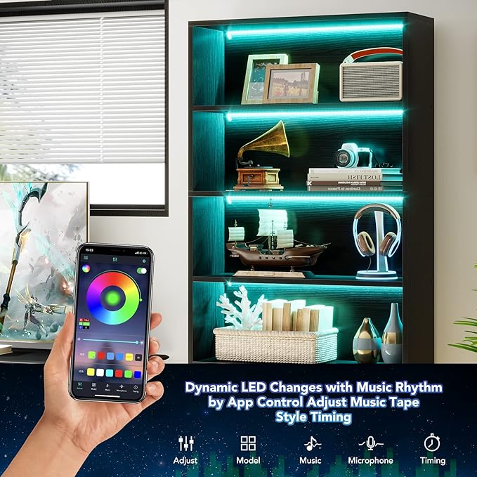 - [5-Tier Bookcases with LED Litinging]: Each tier of our tall bookshelf is equipped with an APP-controlled LED light strip, which can be adjusted to any color and brightness you like. Item weight: 65.4lbs. Heavy and strong.
