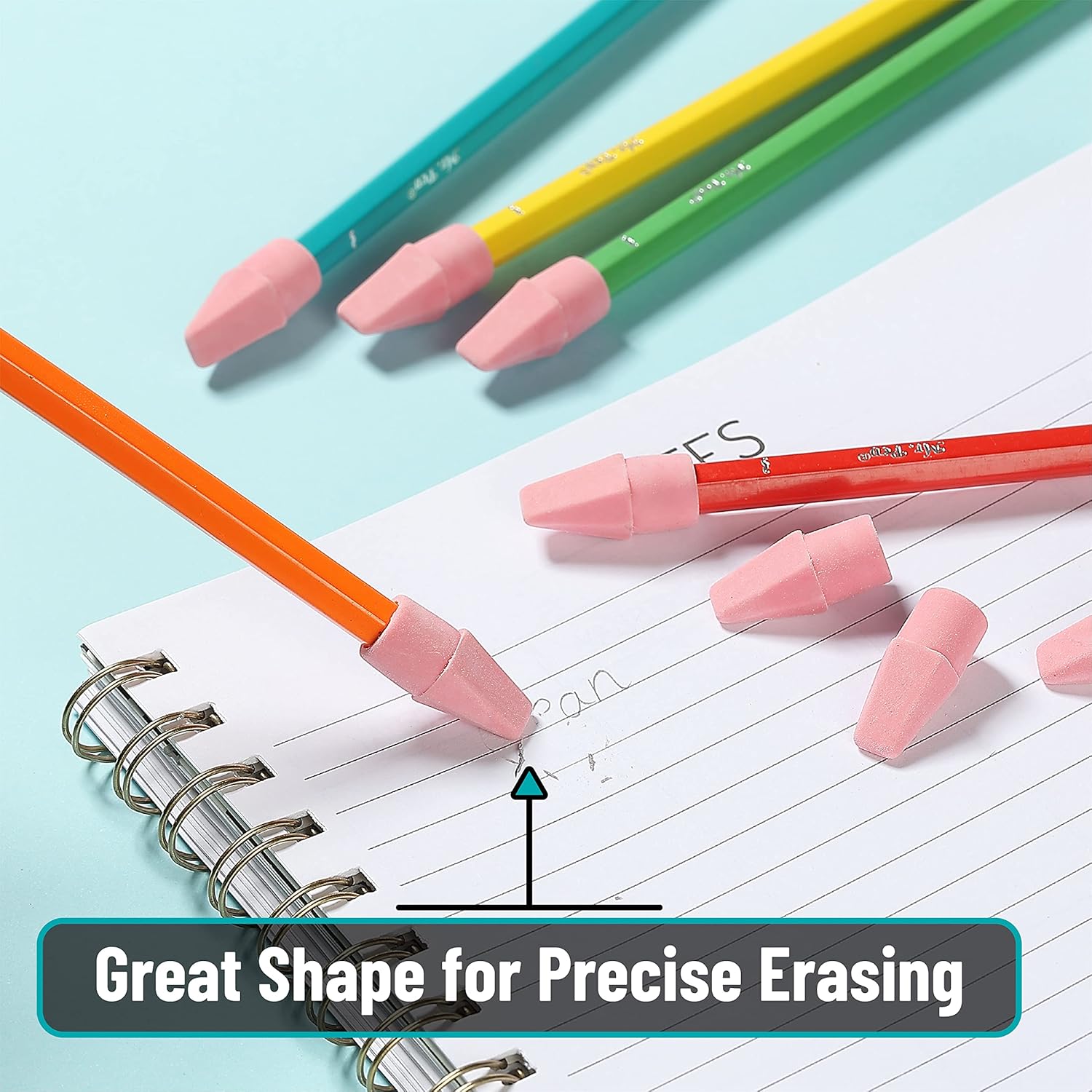 - Package includes 120 pencil top erasers in beautiful pink color. They can also be the protective cap for pens or pencils, prevent tips from breaking, and make clean corrections to office documents and homework.