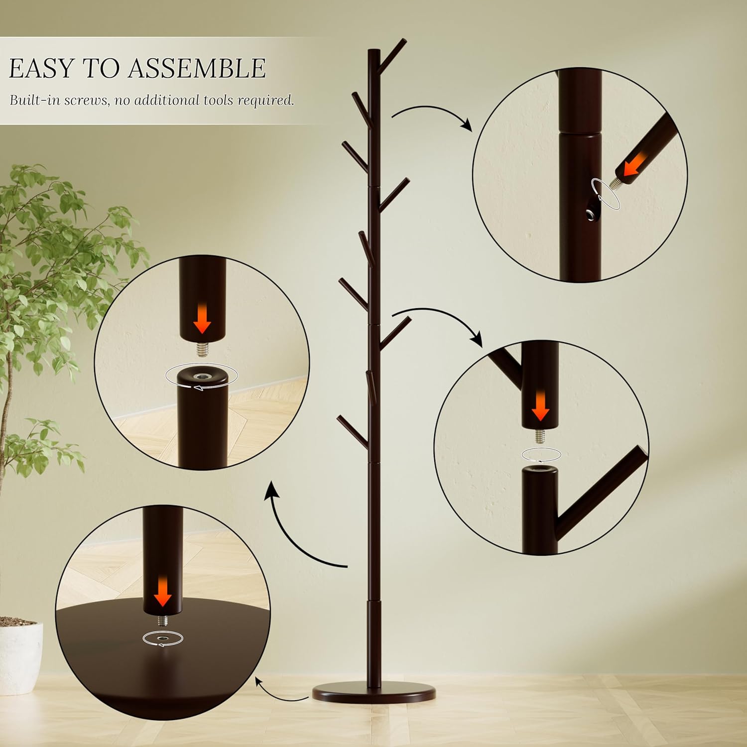 - 【EASY TO ASSEMBLE】 No tools are required, the coat stand is already equipped with metal screw holes, follow the instructions to rotate and tighten, and you will get a stable standing coat rack
